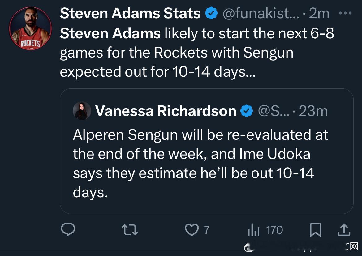 亚当斯未来6-8场会首发,申京缺席10-14天…问题不大…休斯顿火箭休斯顿火箭