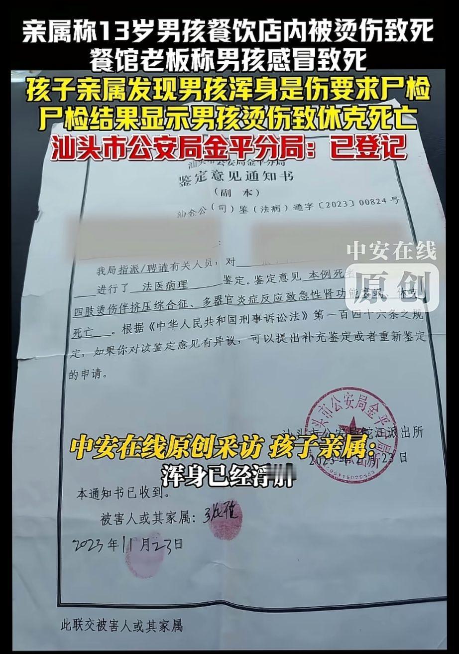 转发:我就住在附近,几乎经过10次,有8次都是在骂这个小男孩,也有看到打,那个时候以为只是简单的小孩子做错事,没想到,事情会这样,我们这附近都知道,那个老板娘对小男孩非常不好。煮粿条有一种大勺子,铁的,那个老板娘就拿这个来敲他的头,头都不是完全的,我真的真的很心疼心酸,我也认识他,我就附近奶茶店上班,那个时候他爸爸一下班就带他来我们店买两杯奶茶,都是买最便宜的,买多几次也就认识他了。小孩子说话有时候会没大没小,但是毕竟是小孩子,他一放学星期六日都要在这家店上班,其实也不知道是不是上班,反正每次路过都看到他在干活,洗碗,打扫卫生,倒垃圾,一个小小的人,拿了两大桶垃圾。我看到他就很心疼,那个时候问他是在这家店上班吗,他也没多说。真的很心疼,会看到他全身是伤,手臂上都能清楚的看到。我就住在附近,我说的都是实话。等到过后我结婚生小孩了,有两三年没见到他了,店也倒闭了,也没去想。等到今年年前听楼下阿姨说,我才知道的。当时知道了的心情很不好,他是那么努力干活的一个小孩,平时穿的也很旧,在这里 我为他打抱不平!!我也是平民百姓,我们要的是公道,请汕头金平区领导要重视。