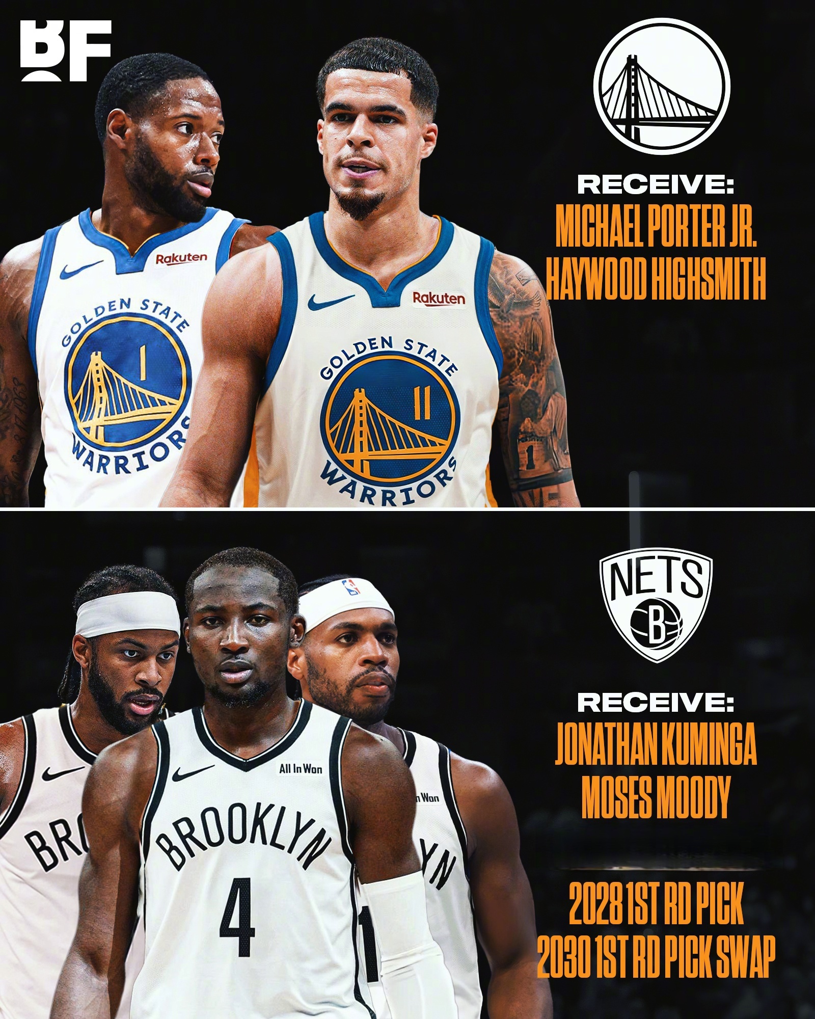 B/R给出的模拟交易方案勇士得到:小波特和海史密斯;篮网得到库明加、穆迪、希尔德、一个首轮签、一个首轮互换权!