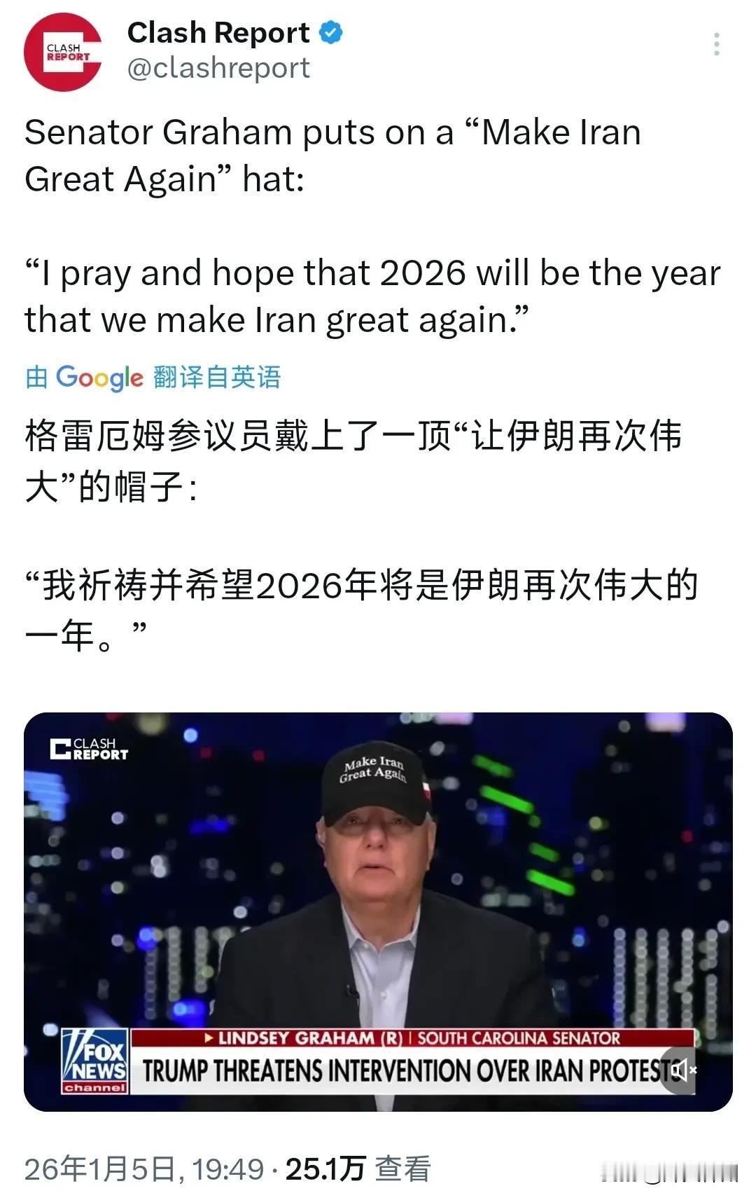 当地时间1月5日,美国参议员格雷厄姆戴上了一顶“让伊朗再次伟大”的帽子:“我祈祷并希望2026年将是伊朗再次伟大的一年。” 评几句: 看到美国参议员格雷厄姆佩戴印有“让伊朗再次伟大”字样的帽子,还提及对2026年的相关期许,这一行为引发了不少舆论争议。 据公开报道,格雷厄姆向来被贴上“战争鹰派”标签,此前曾发表过主张打击伊朗相关设施的激进言论,如今却以“推动伊朗发展”的姿态发声,前后立场的反差引发外界广泛讨论。在不少观点看来,这顶印有口号的帽子,绝非单纯的善意表达,其背后或暗藏深层的地缘政治考量。 所谓的“让伊朗伟大”,在部分舆论解读中,更像是一种带有引导性的话术——本质上是希望伊朗按照特定的方向发展,从而契合相关国家在中东的战略布局。这种借口号输出自身诉求的做法,与直接干涉他国内政的行为有着相似的逻辑内核,都是试图让他国的发展轨迹服务于自身利益。 格雷厄姆此番表态,终究难以摆脱外界对其真实意图的质疑。历史经验早已证明,将自身诉求包装成“善意祝福”的政治话术,终究难以赢得国际社会的广泛认同,也不利于地区的和平与稳定。