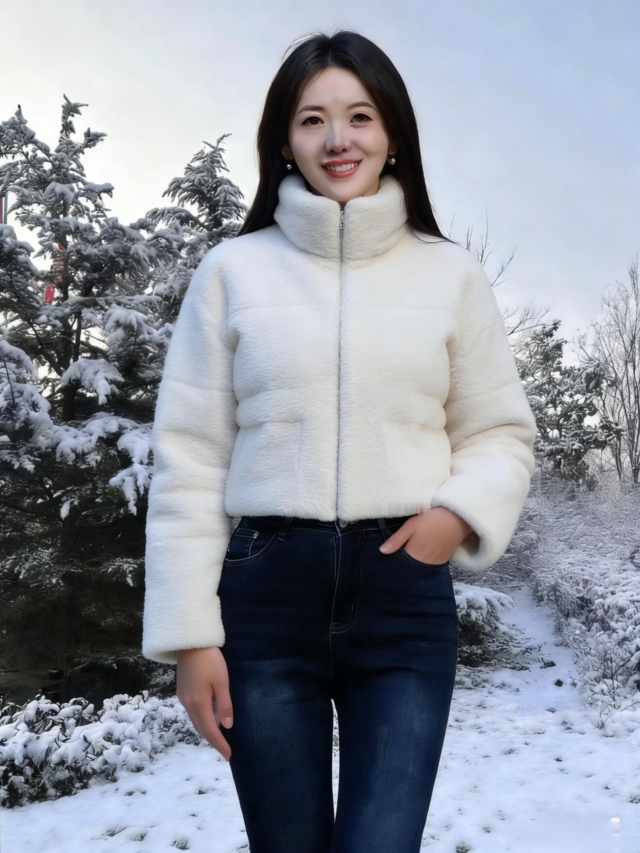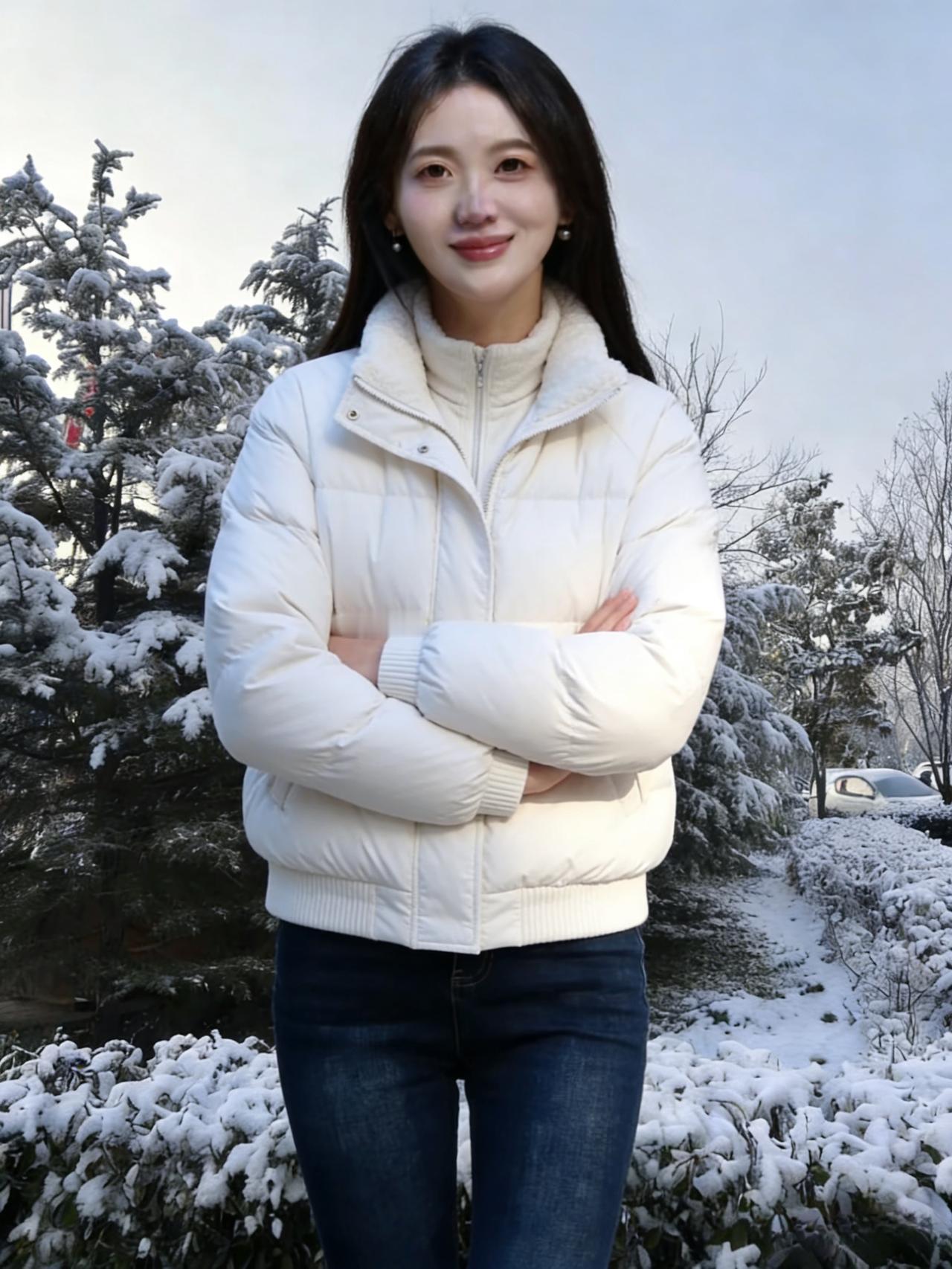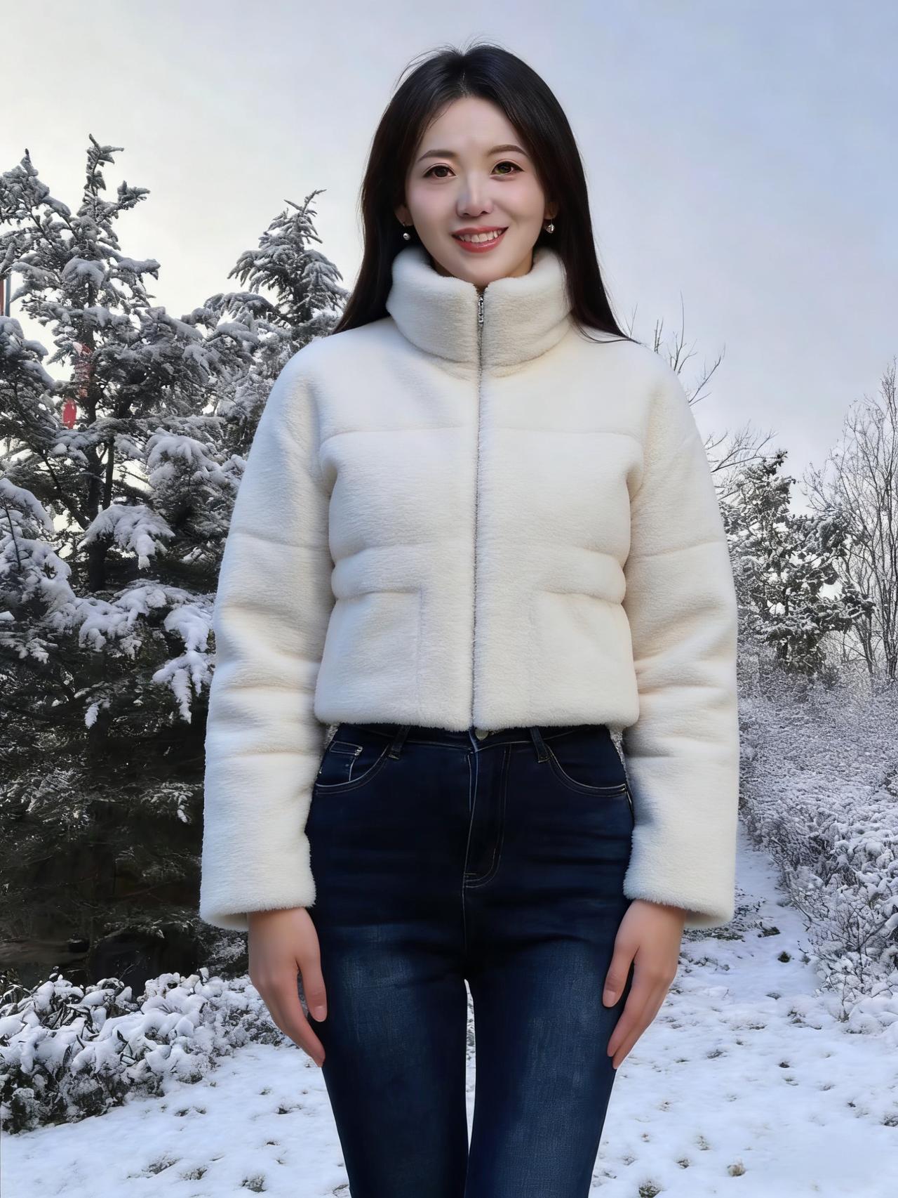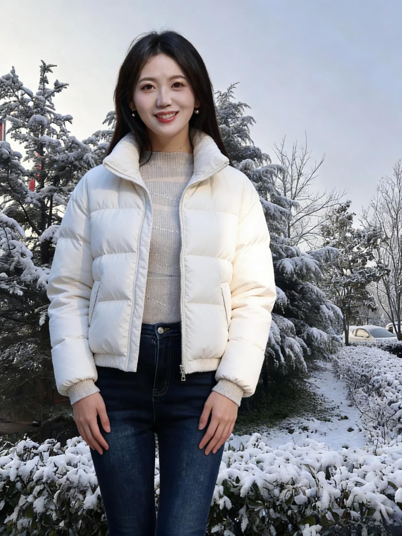 晓雪覆芳园,琼枝挂玉钿。 佳人临曲径,素袂拂寒烟。 步缓惊凫起,言轻落雪旋。 冬容因她秀,不必待花妍。
