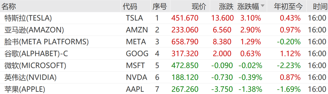 大型科技股涨跌互现,万得美国科技七巨头指数上涨0.41%。个股方面,特斯拉涨超3%,亚马逊涨近3%,脸书涨超1%,谷歌涨0.44%,苹果跌超1%,英伟达跌0.39%,微软跌0.02%。