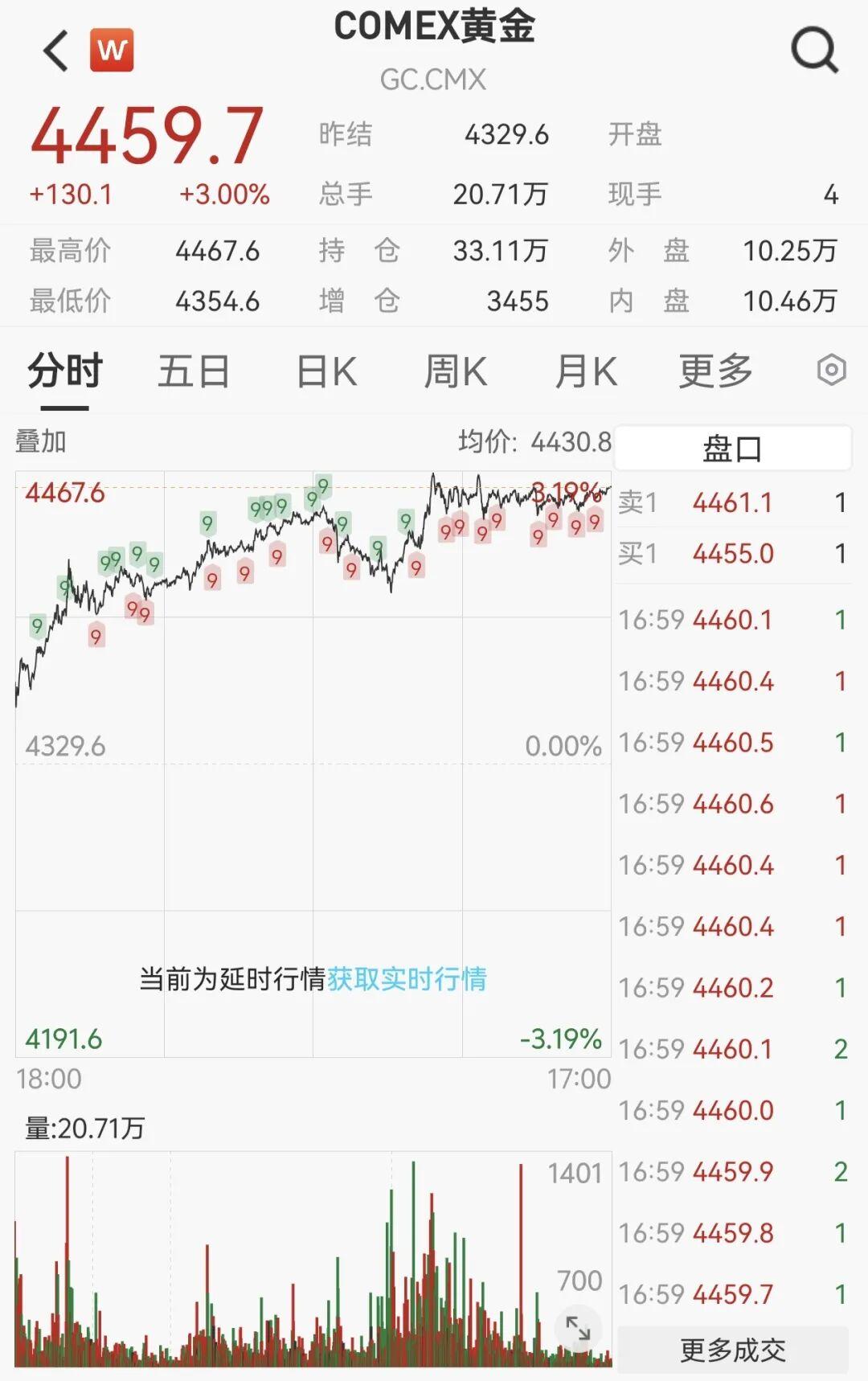 当地时间1月5日,国际贵金属期货普遍收涨,COMEX黄金期货涨3.00%,报4459.70美元/盎司。