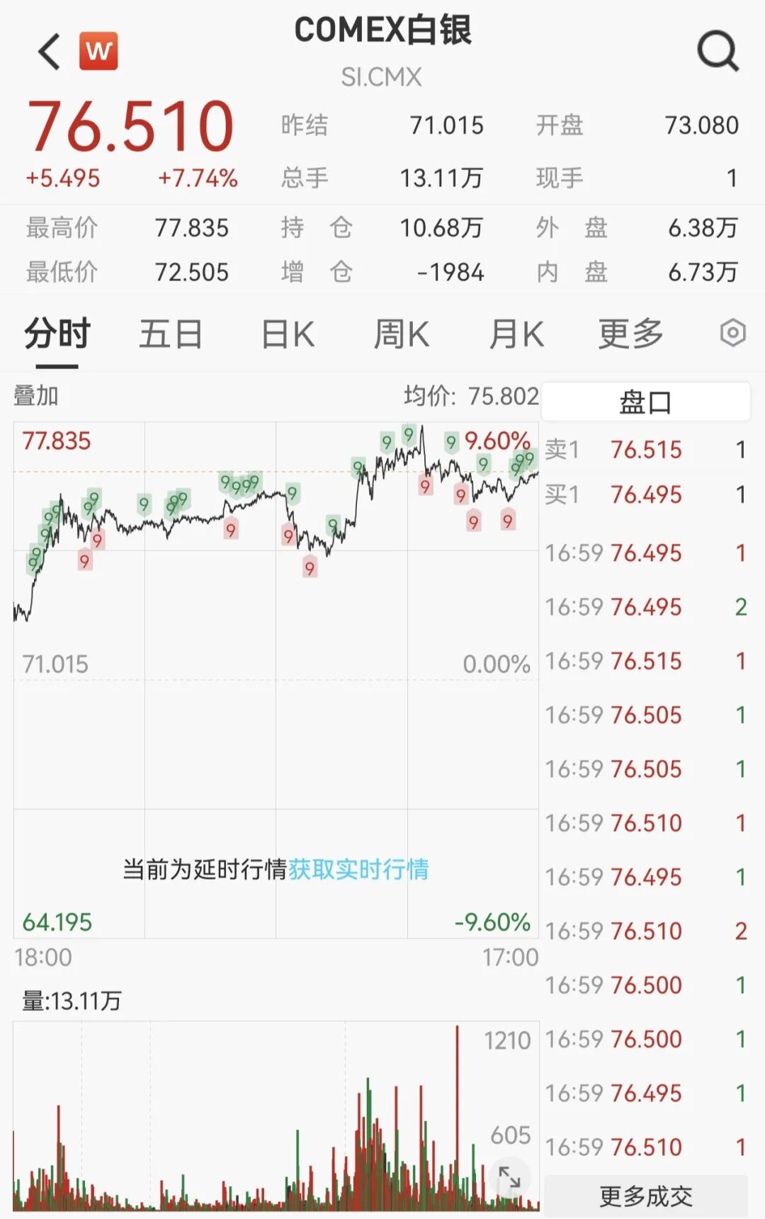 COMEX白银期货涨7.74%,报76.51美元/盎司。