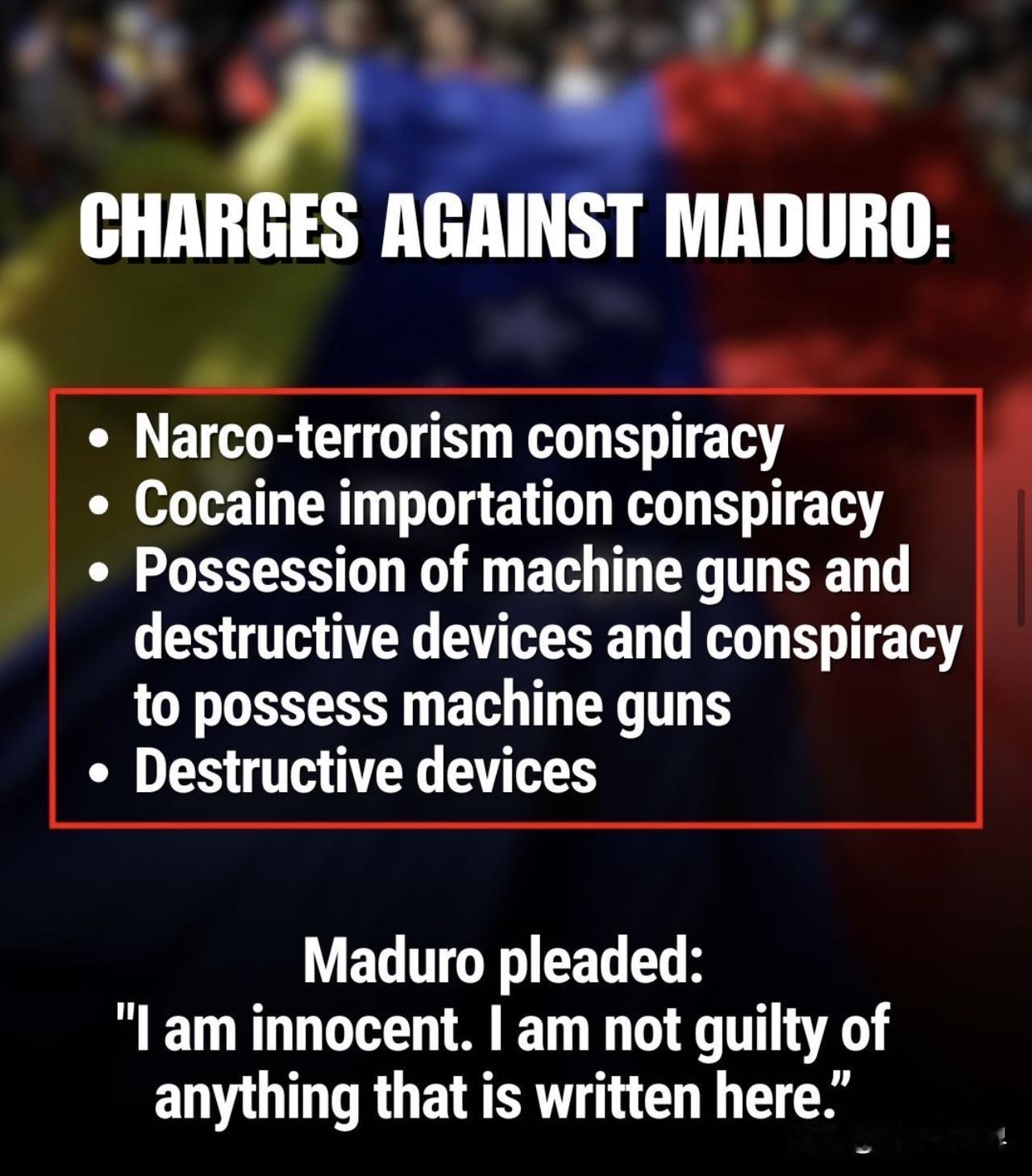 馬杜羅夫婦在美國聯邦法院首次出庭,對毒品、麻醉品恐怖主義和武器指控不認罪。他們會