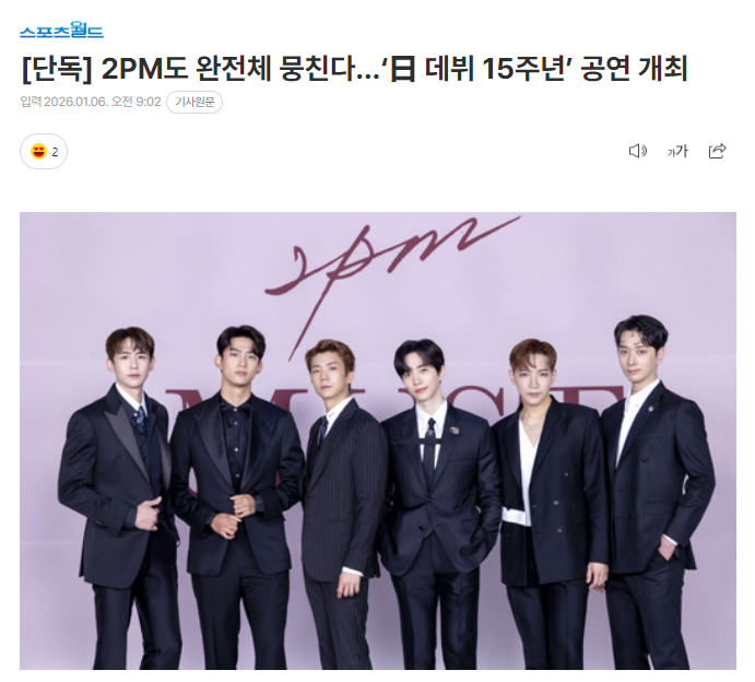 独家:2PM将完整体进行“日本出道15周年”公演6日据独家报道,2PM正在准备今年上半年在日本当地进行的演出。为纪念组合日本出道15周年,曾在韩国和日本举办过演唱会的成员们再次相聚,以在当地出道15周年为契机,向一直以来给予他们厚爱的日本粉丝们表达感谢。。