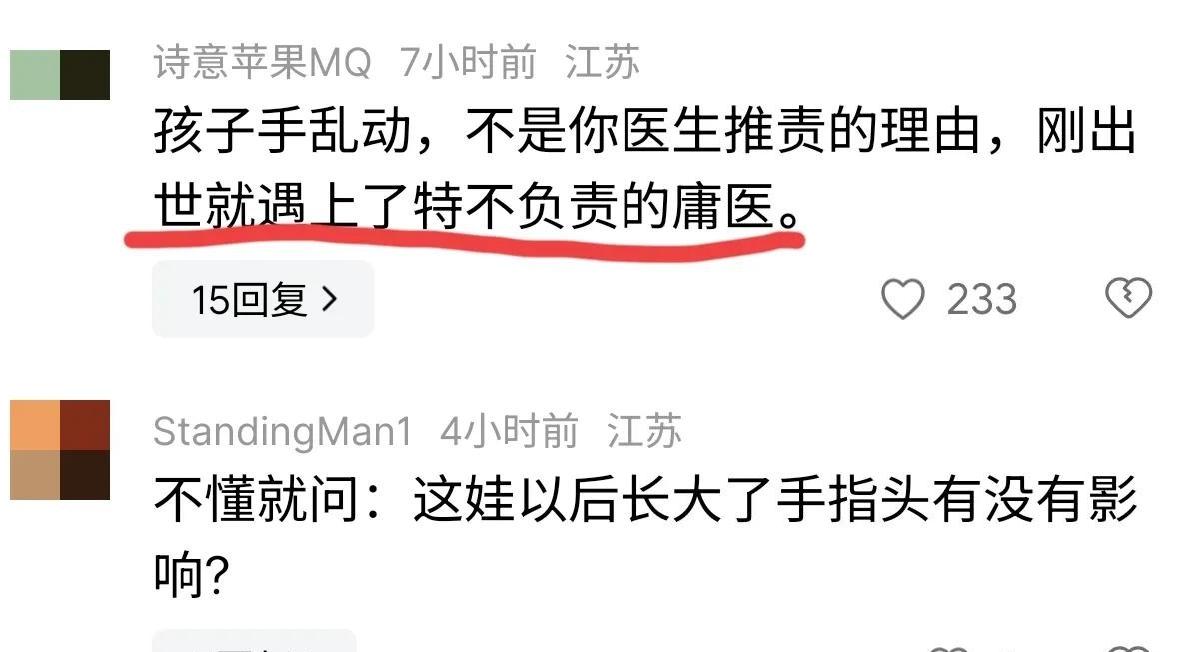 太离谱! 江苏一婴儿手指被剪断,院方提出赔10万元,遭家属拒绝 江苏淮安盱眙县人民医院,一个本该迎来新生命喜悦的地方,却在2025年12月25日这天出了大事。剖宫产手术后,刚出生的男婴在剪脐带时,左手中指被助产士剪断,几乎只剩皮连着。家属盛先生说,直到中午才被告知,孩子手已经伤成那样了。 当时妻子还在恢复,他不敢说实话,只能自己扛着。先带孩子去南京儿童医院,没接;又连夜转到无锡市第九人民医院,终于做了断指再植手术。医生说血管能接上,但神经太细,孩子太小,没法修复。以后这手指能不能灵活用,真不好说。 术后孩子住了一周,钢针固定着,一动就疼,夜里经常哭醒。现在人回来了,还在盱眙医院观察。盛先生请了长假,陪产假都用完了,家里就靠老人照顾产妇和宝宝。 他说最气的是,院方一开始轻描淡写,说是孩子手突然动了,才导致失误。可断脐是常规操作,新生儿动一下就这么容易出事?监控还刚好拍不到,位置是死角。涉事助产士只被停了几天下班,之后就回岗了。 医院后来提出赔10万,说是一次性了结。盛先生没同意。这点钱,连以后复查、取钢针、康复治疗都不够,更别说对孩子心理的影响。刚出生就遭这种罪,以后写字、拿东西会不会受影响?谁说得准。 他现在申请了医疗事故鉴定,走的是正规流程。卫健委也介入了,通报承认是助产士操作严重失误,医院管理有漏洞。涉事人员已停职,院方也道歉了,说会负责后续治疗。 但这事不是道个歉、赔点钱就能翻篇的。天眼查显示,这家医院近两年医疗纠纷诉讼有14起。一个三级乙等医院,又是“千县工程”示范单位,怎么老出问题? 盛先生不想要煽情,也不搞网暴,就想把事实弄清楚。是谁的责任,该怎么赔,有没有改进措施,都得有个说法。孩子才一个月大,以后路还长。 事情在网上发酵后,医院才开始重视。之前沟通时,只让选两个方案:要么拿10万走人,要么打官司。家属觉得,这不是解决问题的态度。 目前孩子还在恢复,取钢针还得再去无锡。院方口头说报销费用,但一直没落实。盛先生说他不怕麻烦,只要结果对得起孩子就行。新生儿医疗事故 婴儿手术风险 手指断赔偿