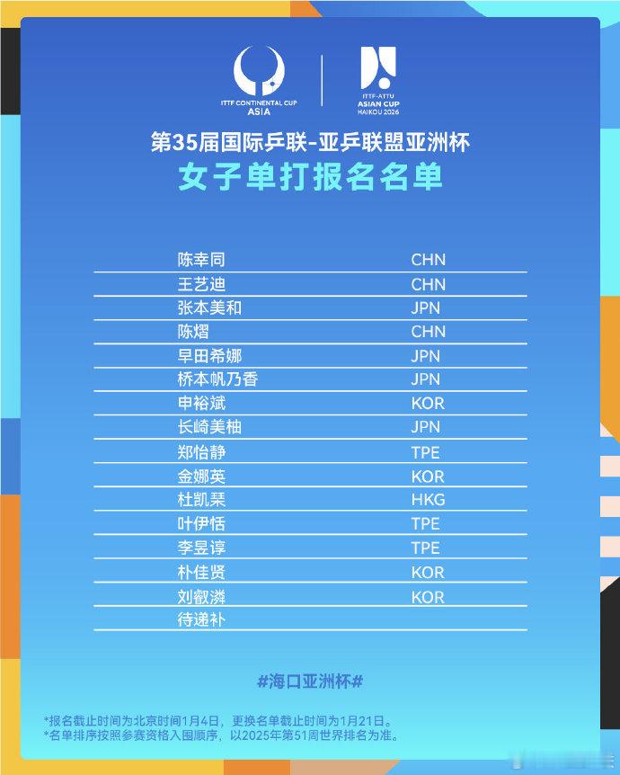 海口亚洲杯国乒阵容第35届国际乒联-亚乒联盟亚洲杯将于2月4日至8日,在中国海口市五源河体育馆举行。本届亚洲杯设男女单打两个项目,各有32名球员参赛【男单】王楚钦、林诗栋、梁靖崑、向鹏、陈垣宇、周启豪【女单】孙颖莎、王曼昱、蒯曼、陈幸同、王艺迪、陈熠赛事门票将于今日正式开启首次售票,18:18开启单日通/全赛程通票销售,19:19开启单场次门票销售乒乓球亚洲杯门票今日开售