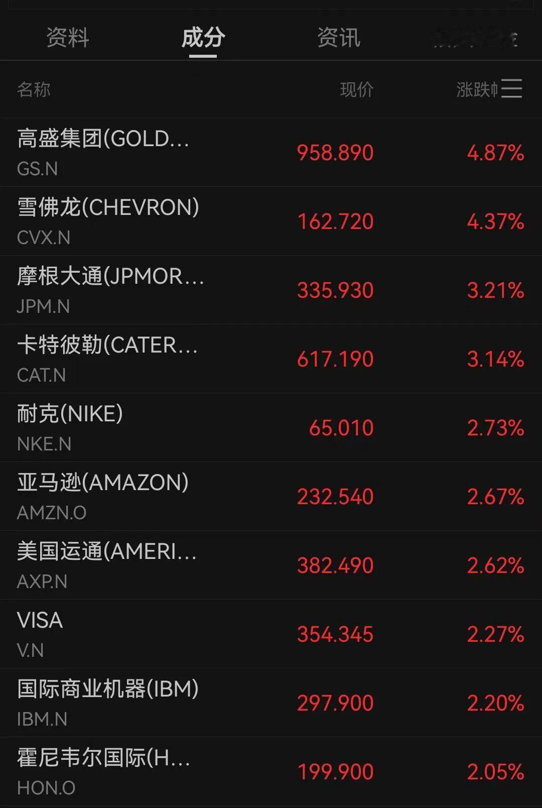 道指首次突破49000点,最新上涨1.33%。成分股中,高盛、雪佛龙涨超4%,摩
