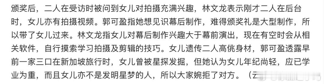 TVB在澳门举办《万千星辉颁奖典礼》,现场星光熠熠,除了现役TVB艺人悉数登场之外,TVB还邀请了很多已经离巢的小生、花旦,以颁奖人的身份现身,给大家制造惊喜,其中就有郭可盈、林文龙夫妇。郭可盈自曝女儿被星探发掘,称全家已婉拒,15岁女儿长得像林文龙