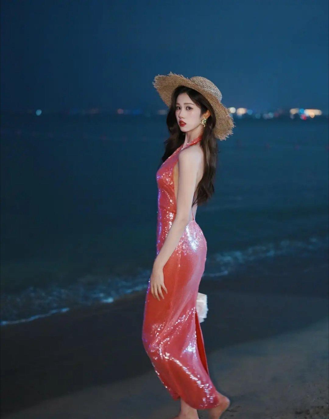 2024香港小姐竞选季军杨梓瑶(Amina)近年向内地发展,成功大改造,尽秀玲珑浮凸身材,闪亮低胸露背裙沙滩留倩影