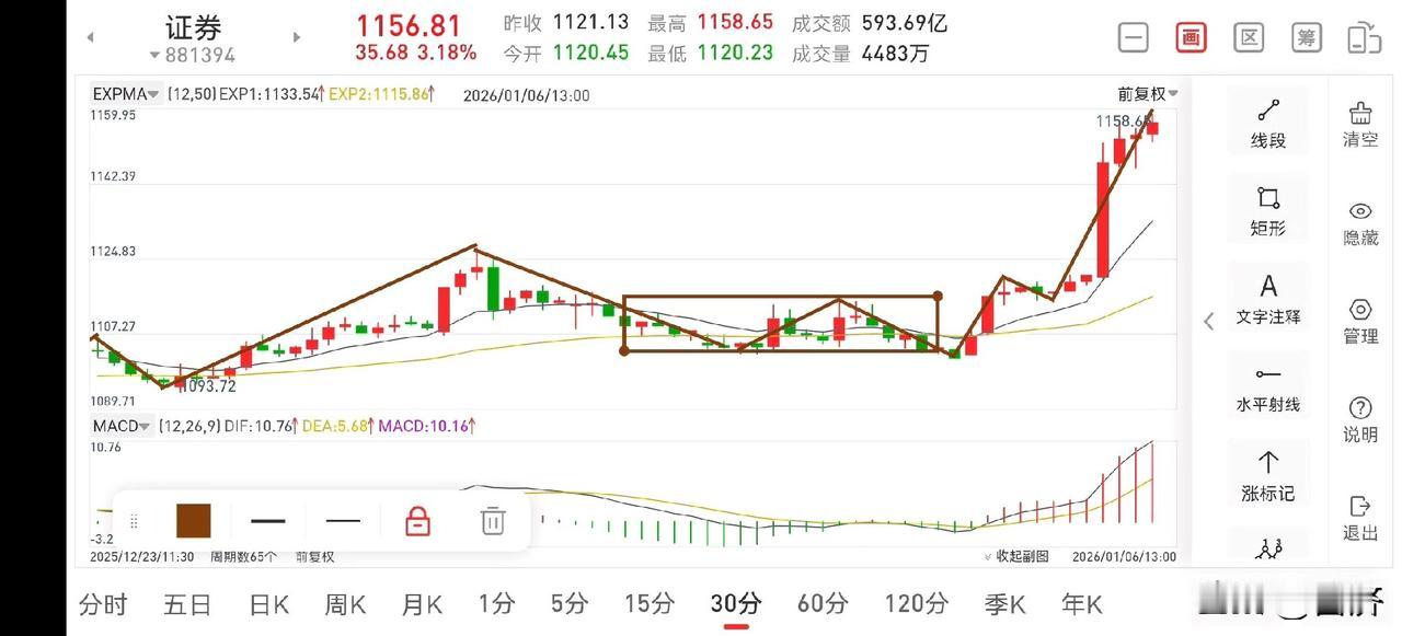 聊聊证券板块(2026.1.6) 证券板块在经过前期的震荡整理后,昨天的强势上涨确认了阶段性调整结束,春节红包行情就此展开,有人说我的观点转变的太快了,我只能说,你对股市的理解太浅薄了,股市本身就是多变的,对于操作者来讲,更重要的就是及时应对,如果你学不会应对,那么你很难在股市中生存下去。 1.从日线图一上看,在确认二买点A后,今天再次迎来强势上涨,昨天在文章中讲过,这是日线级别的上涨,如果你是一个中长线投资者,在没有日线级别走坏的情况下都是可以持股待涨的,任何上涨过程中的波动都可以忽略不计。 2.从30分钟图二上看,上午的强势上涨已经出现乖离率偏大,此处有小范围调整的技术需求,不管它如何调整,介入后都无需理会。 3.从5分钟图三上看,目前正在构建5分钟中枢,至于中枢构建完成后如何演绎,需要根据实时走势来应对,它有可能会进一步攀升,当然也有可能直接回踩30分钟一笔都是有可能的,这是无法预测的,只能边走边看来做好应对。总之这里是机会大于风险,如果你还没有介入,也不用着急,继续等待下一个买点出现再介入也不迟。比如说下一个30分钟二买点或者下一个日线二买点都是可以的,到时我也会做出友情提醒。证券板块解析 股票交易