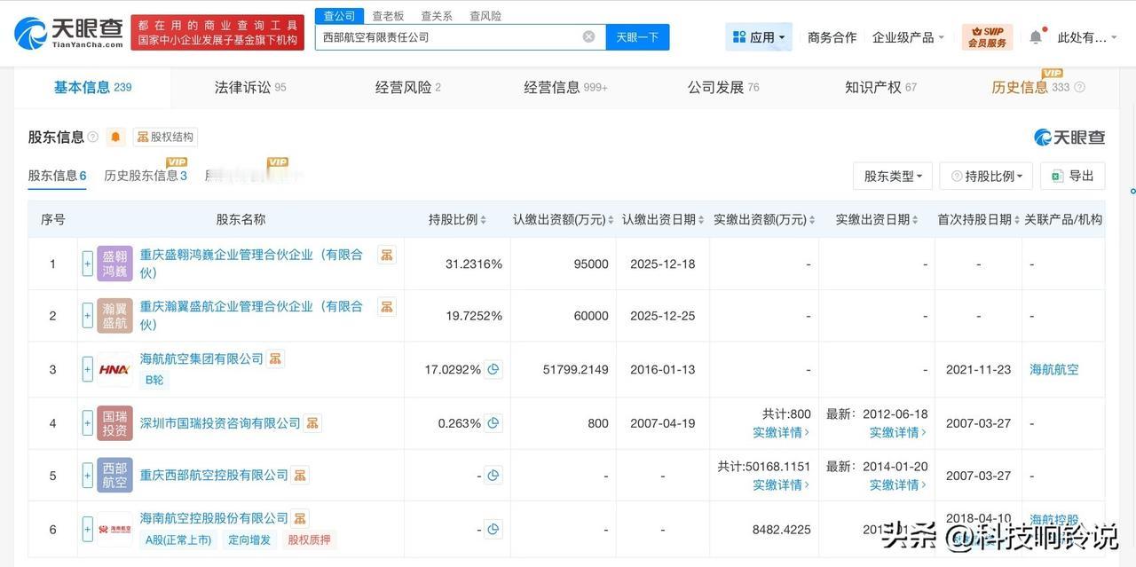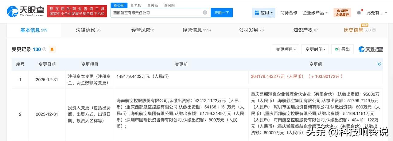 【西部航空增资至30.4亿 增幅约104%】 天眼查工商信息显示,近日,西部航空有限责任公司发生工商变更,注册资本由约14.9亿人民币增至约30.4亿人民币,增幅约104%,同时,新增重庆盛翱鸿巍企业管理合伙企业(有限合伙)、重庆瀚翼盛航企业管理合伙企业(有限合伙)为股东。 西部航空有限责任公司成立于2007年3月,法定代表人为王科,经营范围含国内航空客货运输业务、至周边国家的国际航空客货运输业务、餐饮服务、住宿服务、食品销售、出版物零售、航空公司间的代理业务、与航空运输业务有关的服务业务等。股东信息显示,该公司现由重庆西部航空控股有限公司、海航航空集团有限公司、海南航空控股股份有限公司及上述新增股东等共同持股。 天眼查信息: