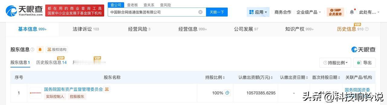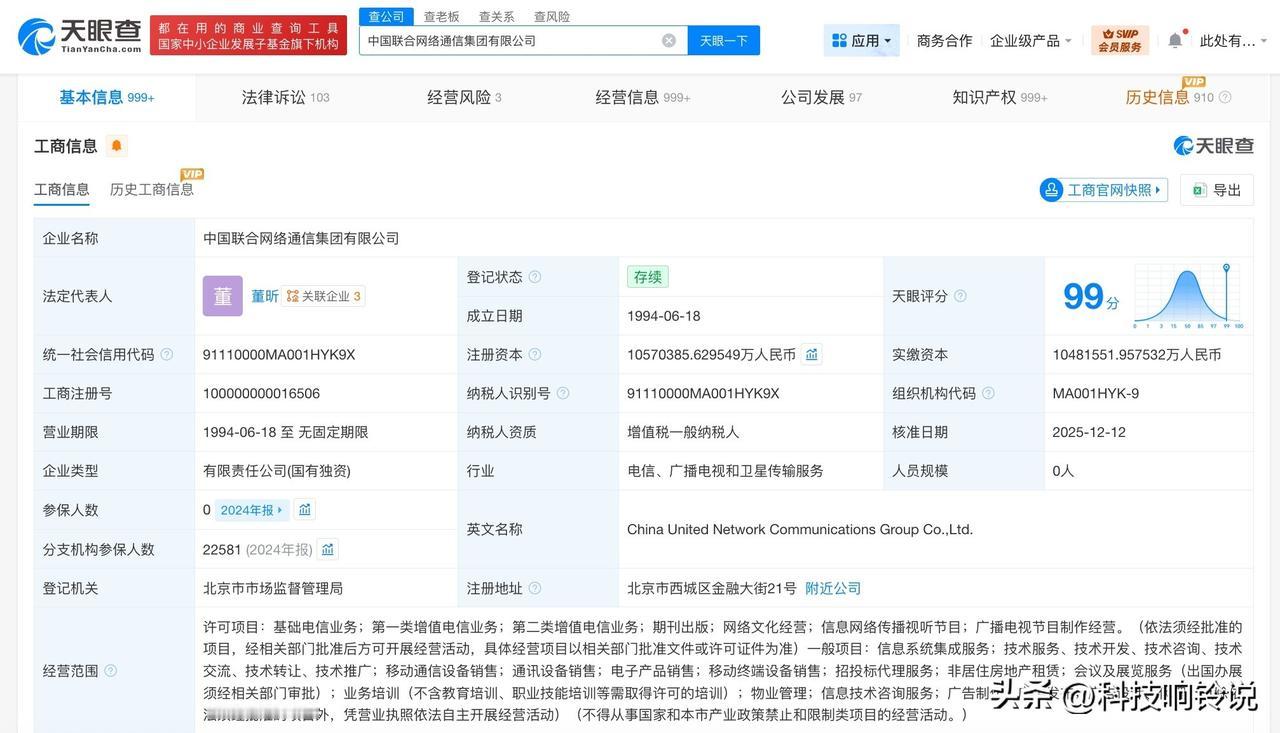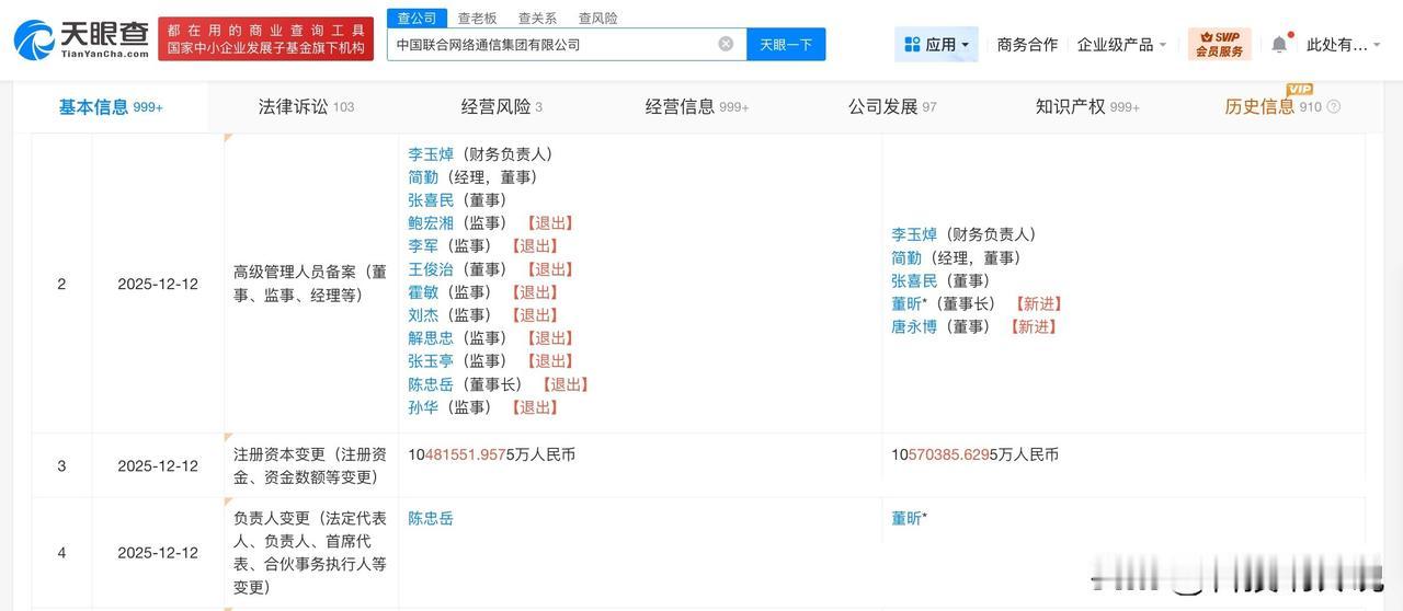 【中国联通集团换帅完成工商变更 中国联通集团增资至1057亿】 天眼查工商信息显示,近期,中国联合网络通信集团有限公司发生工商变更,陈忠岳卸任法定代表人、董事长,由董昕接任,注册资本由约1048亿人民币增至约1057亿人民币,同时,多位高管发生变更。 该公司成立于1994年6月,经营范围含基础电信业务、网络文化经营、信息网络传播视听节目、广播电视节目制作经营、信息系统集成服务。股东信息显示,该公司由国务院国有资产监督管理委员会全资持股。 据媒体报道,此前,中国联合网络通信集团有限公司召开中层以上管理人员大会。董昕同志任中国联合网络通信集团有限公司董事长、党组书记。 天眼查信息: