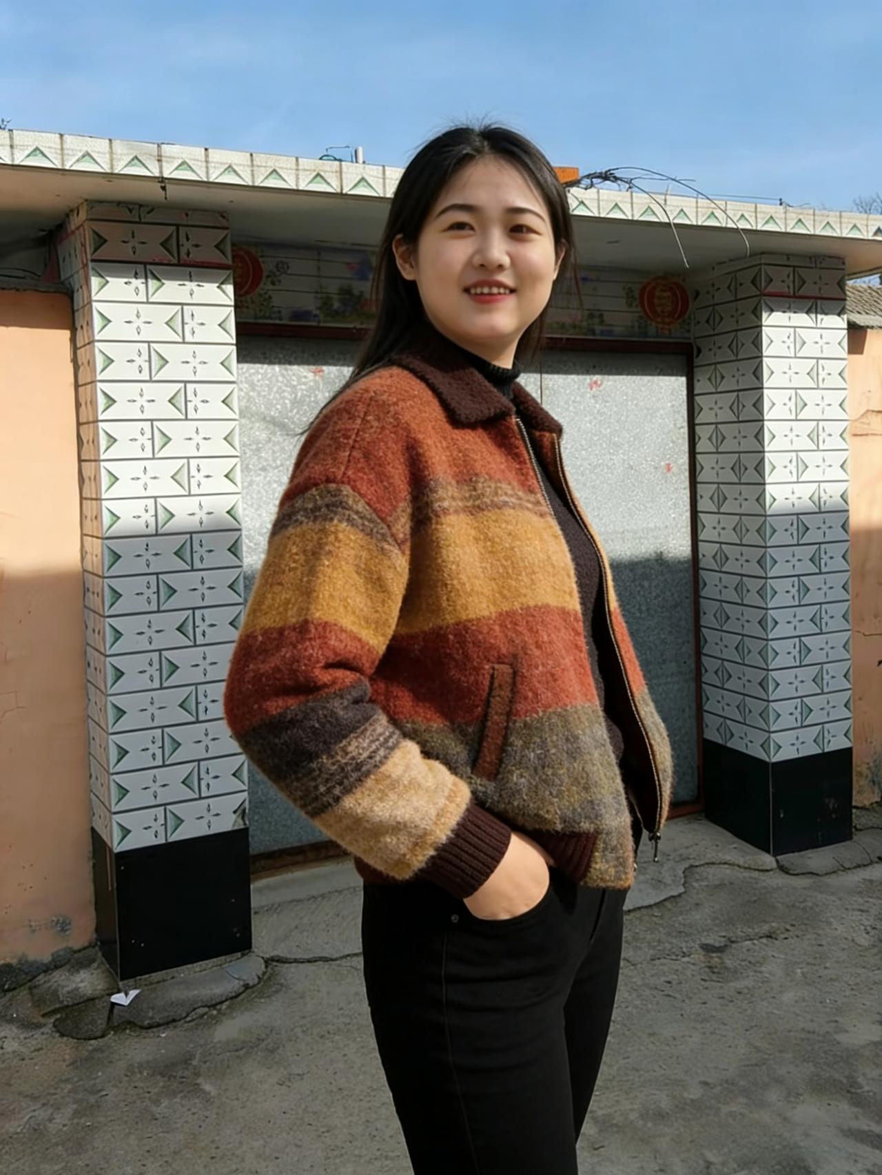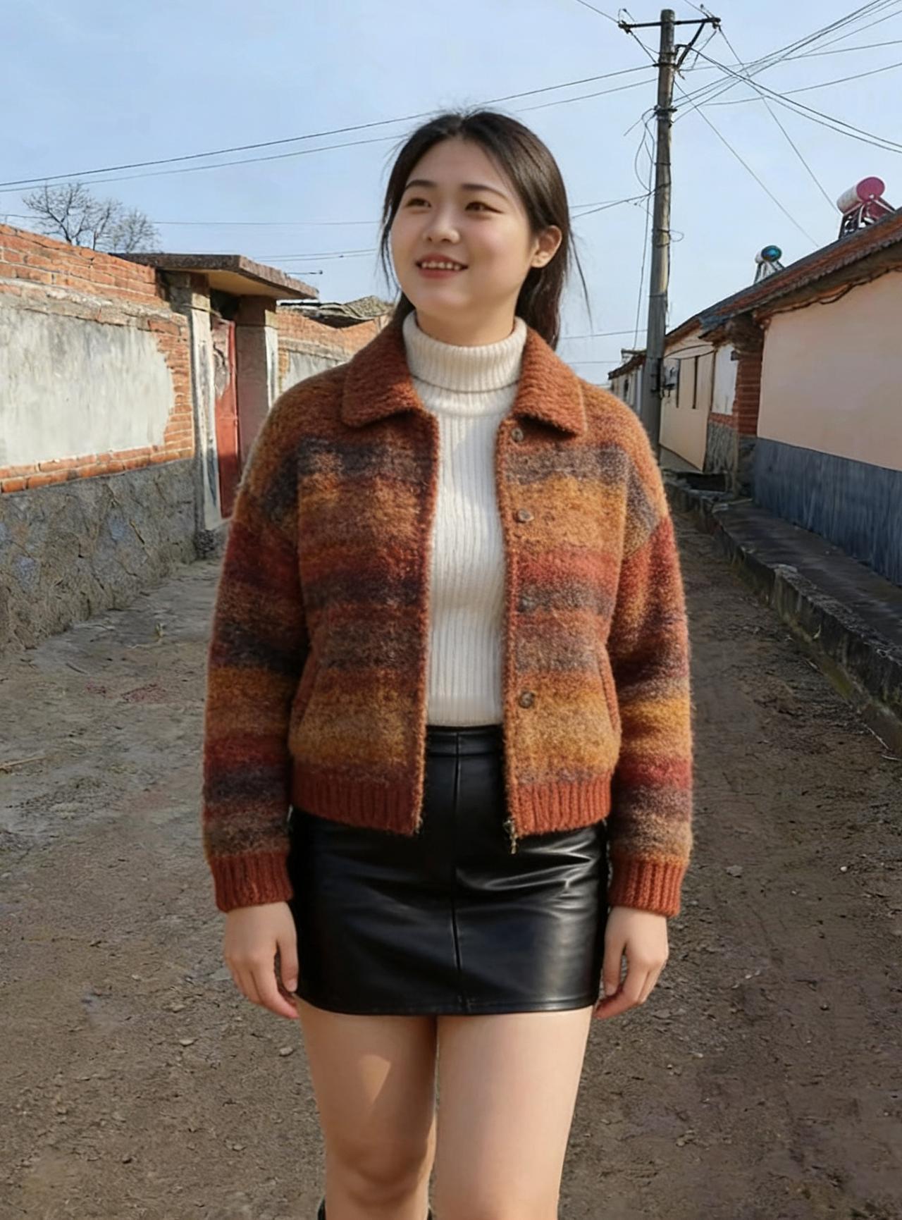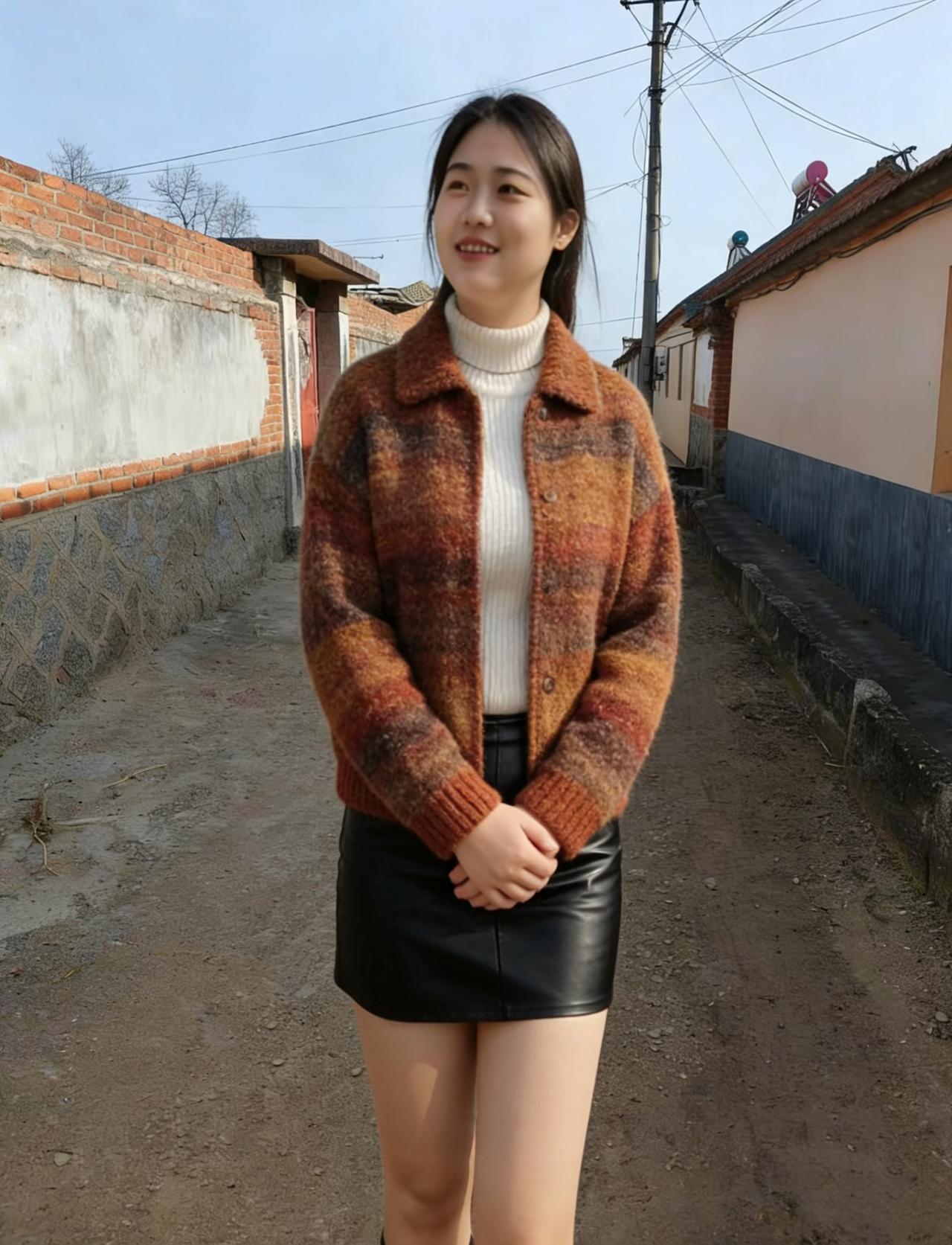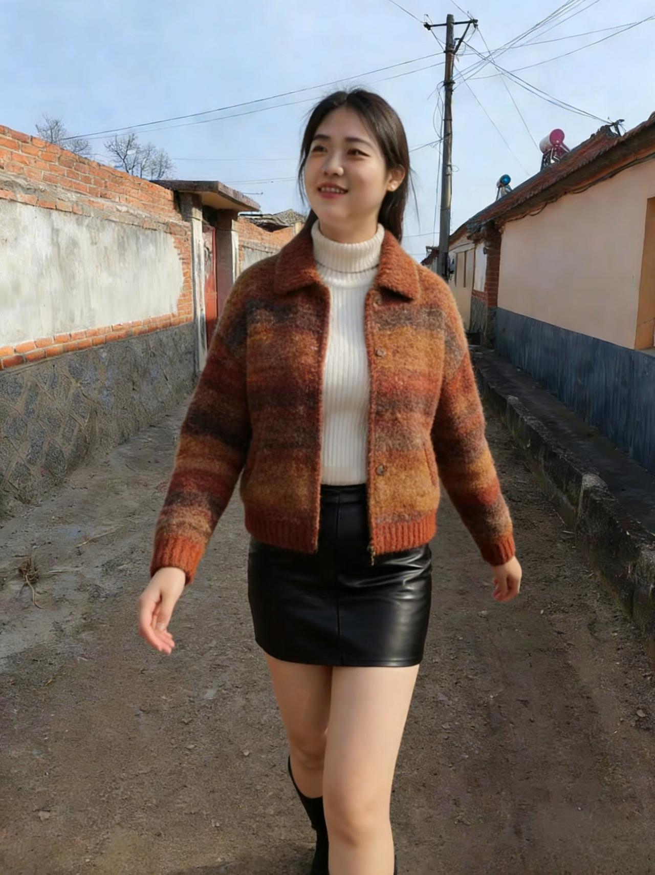 砖路在脚下延伸,像未写完的长信 电线杆牵着云,掠过她肩头的针织纹路 宝马的银白在身后,是金属的静物 她站着,风掀动发梢,把冬的凉揉成软的绒 ~ 皮裙裹着烟火气,也裹着年轻的心跳 不是城里橱窗的精致,是灶火煨着粥的温暖 院墙的瓷砖刻着菱形花纹,红漆春联褪了色 她的笑,却比檐角的暖阳更烫人 ~ 村道的土味混着针织衫的羊毛香 一只麻雀落在电线上,看她把双手插进口袋 像握住了整个村庄的温柔 那些被日子磨亮的琐碎,在她眼里 都成了闪光的星子 ~ 她是村口的树,扎根泥土,却向着风舒展枝桠 毛衣的条纹绕着腰身,是年轮,也是诗行 冬的寒撞过来,被她的笑撞碎在砖路上 影子贴着地面,和村庄的影子叠在一起 她不是远方的风景,是这方土地长出的花 开在烟火里,开在每一个清晨的炊烟里 开在村道的暖阳里,不张扬,却鲜活