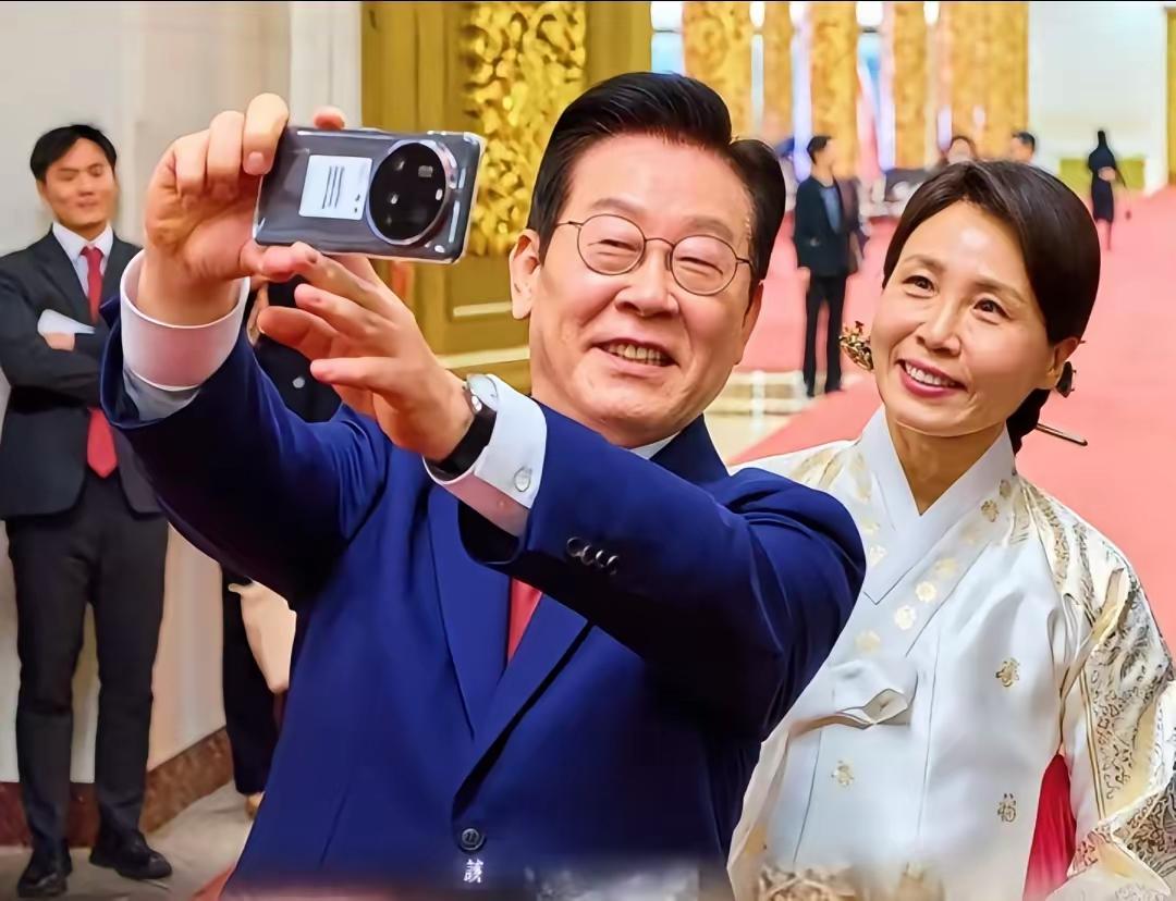 李在明和夫人在人民大会堂自拍合影 昨天,在人民大会堂举行的活动间隙,韩国总统李在明和夫人自拍: 李在明一身深色西服很精神,看着镜头在笑,眼睛眯成了一道缝; 他的夫人,身穿民族服饰,挽着发髻,也在微笑着看着镜头,温柔端庄…… 身后是红色的地毯,和金碧辉煌的人民大会堂 一旁的工作人员,饶有兴趣地微笑着看着他们。 这对老夫妻,一路走来,太不容易了! 这一刻,可能是他们最轻松快乐的时光!