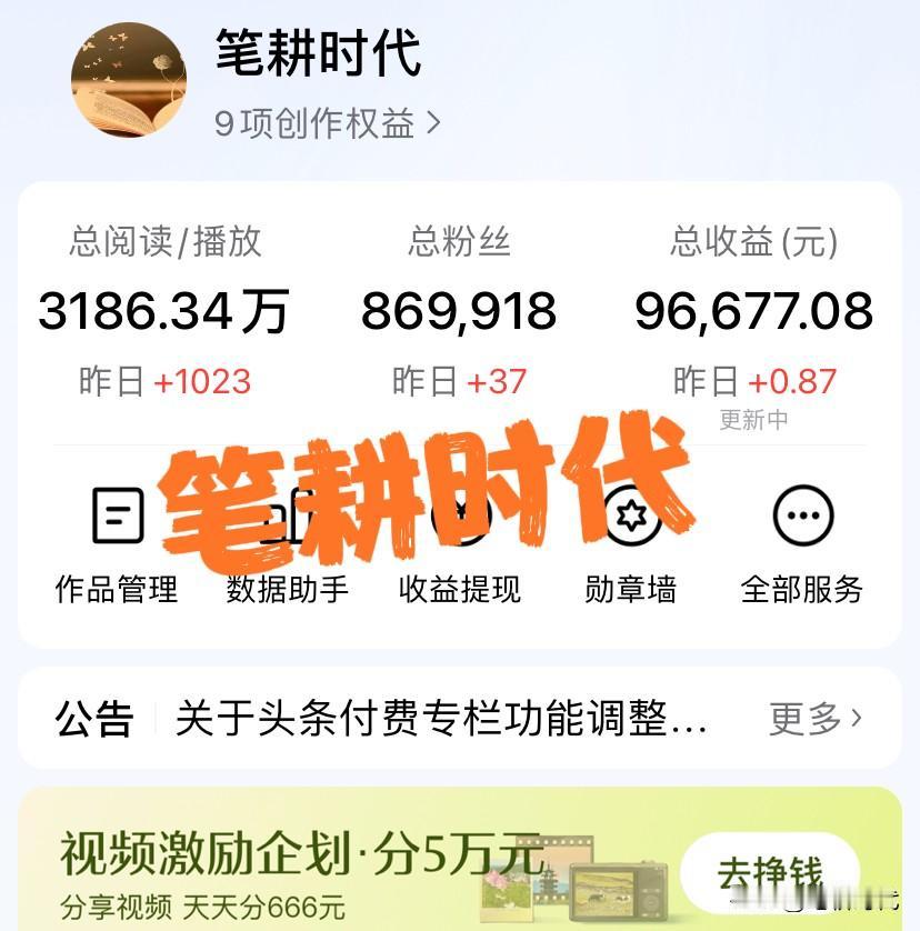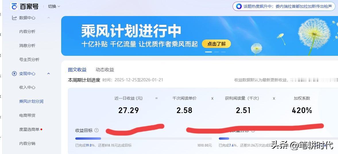 谁比我惨?已连续一周收益个位数了,今天只有几毛。幸好百家号一万阅读单价直逼100多,给了一丝丝希望。 来头条两年凑十万还差3千多,只有一个月时间了,看来暂时是完不成了。 在头条码字两年,第一次遇到如此惨淡的收益, 从12月31日起,收益已连续保持个位数,甚至今天只有几毛。 每日至少一篇是更新的,微头条是我最不擅长的,很难有高阅读量。收益主要来自写文章。 近期,写文章少阅读量少,没有劲头,写一篇需要几个小时。有时就写微头条敷衍。 除了这个原因最主要还是推荐量少了,也可能跟写作内容有关,或还有其他原因。 瞬间觉得在头条上很难混,今天起,暂时把重心转移至百家号。以前百家号最多更新一篇,一万阅读量单价就有100多一点。 昨日,百家号收益虽然不到30元,但阅读量只有2500左右。 要是同样的精力在百家号创作,一天赚个一百元,或许不是难事。之前有时一天也赚个几百。 总的来说,头条赚得多,但是感觉到头条平台的风向正在悄悄变化,赚上百收益是很难了。 两年凑十万整的愿望寄希望于百家号平台来实现了!