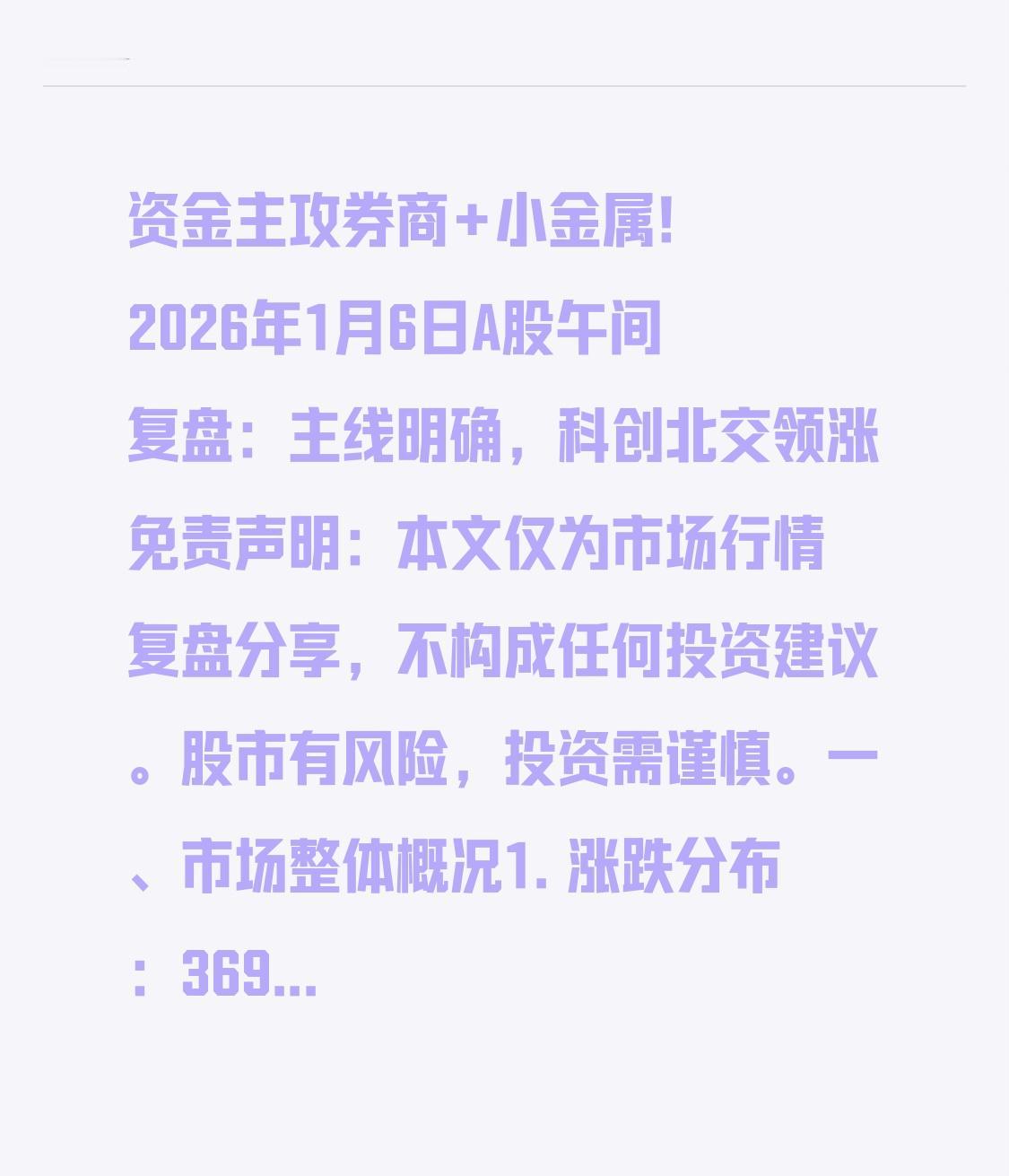 资金主攻券商+小金属!2026年1月6日A股午间复盘:主线明确,科创北交领涨