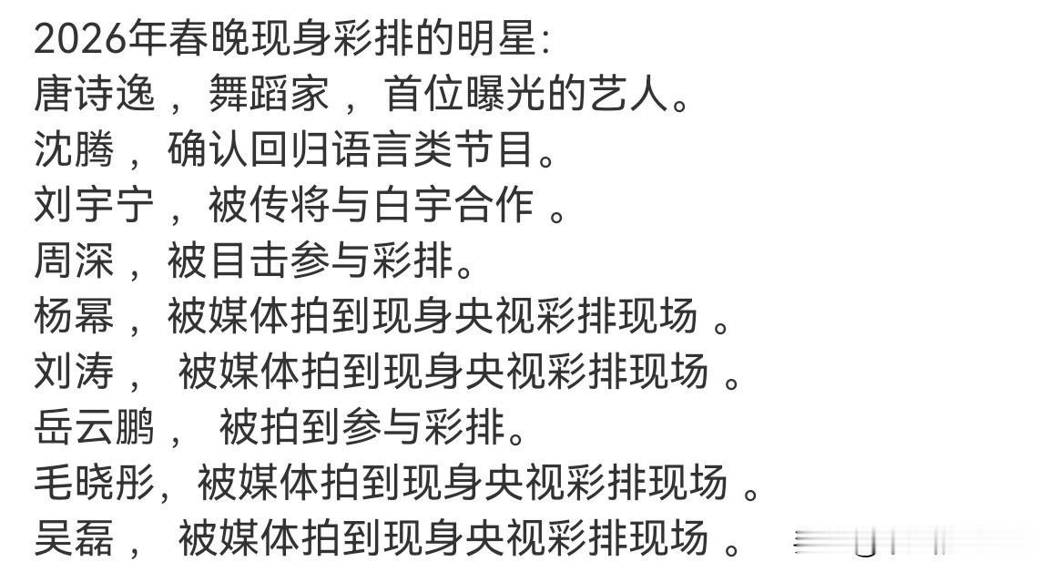 近日,2026年央视春晚已正式开启彩排,首批路透艺人包括唐诗逸、沈腾、刘宇宁、周深、杨幂、刘涛、岳云鹏、毛晓彤、吴磊等。 岳云鹏虽然每年的表现都差强人意,但央视春晚节目组还是会邀请他,真不知道他们是怎么想的。 我比较期待周深、沈腾和杨幂的节目,大家最期待哪位艺人登上春晚舞台呢?
