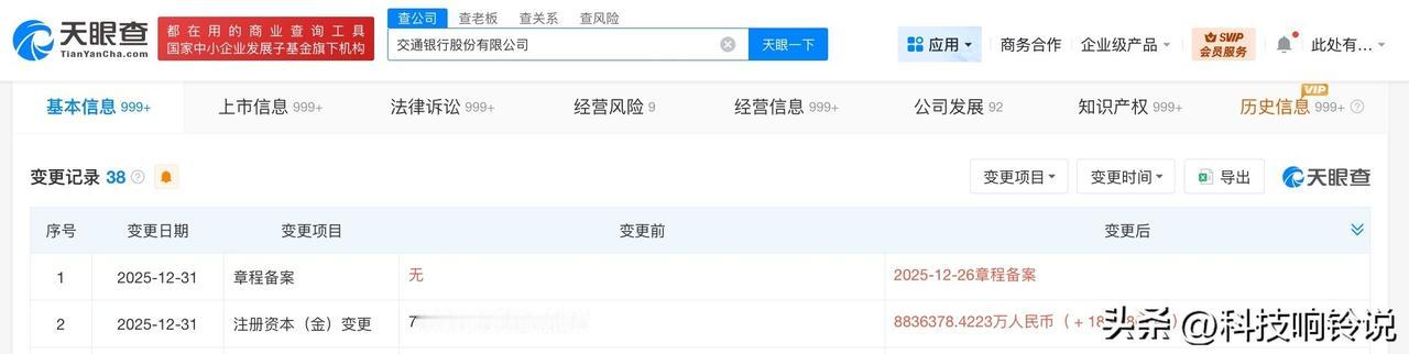 【交通银行增资至883.6亿 增幅约19%】 天眼查工商信息显示,近日,交通银行(601328)发生工商变更,注册资本由约742.6亿人民币增至约883.6亿人民币,增幅约19%。 交通银行股份有限公司成立于1987年3月,法定代表人为任德奇,经营范围含吸收公众存款,发放短期、中期和长期贷款,办理国内外结算,办理票据承兑与贴现,发行金融债券,代理发行、代理兑付、承销政府债券等。股东信息显示,该公司由中国证券金融股份有限公司、首都机场集团有限公司、香港中央结算有限公司等共同持股。 天眼查信息: