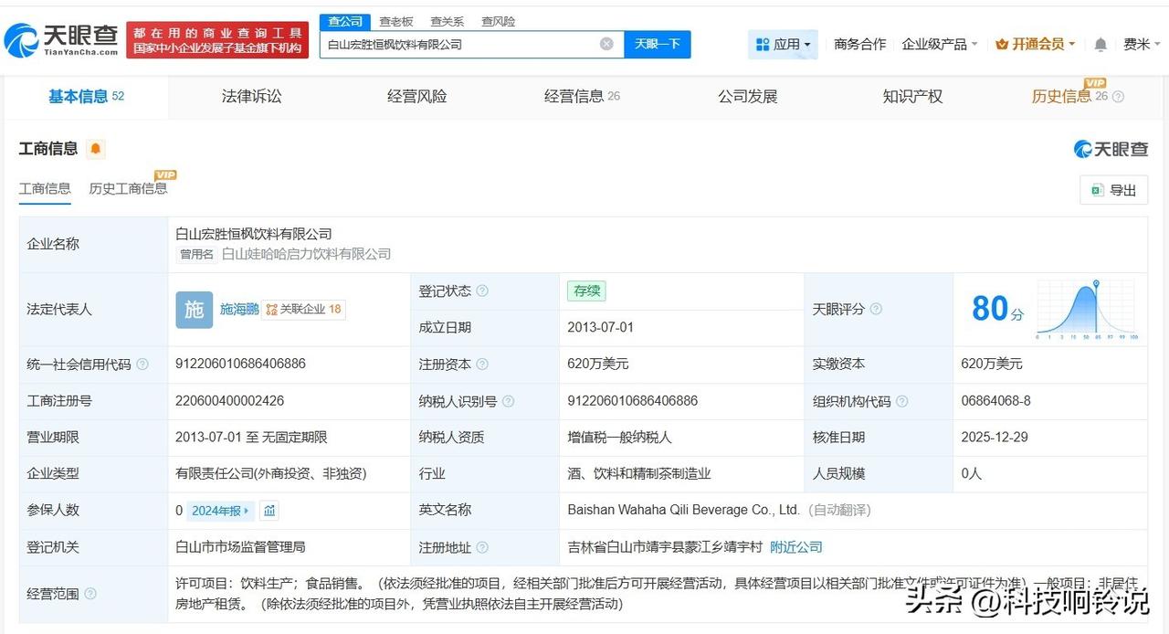 【娃哈哈旗下白山延边两地公司更名宏胜 娃哈哈旗下两家公司更名宏胜】 天眼查工商信息显示,近日,延边娃哈哈启力饮料有限公司发生工商变更,企业名称变更为延边宏胜饮料有限公司。 延边宏胜饮料有限公司成立于2008年4月,法定代表人为施海鹏,注册资本500万美元,经营范围包括食品生产、食品销售、食品用塑料包装容器工具制品生产等。股东信息显示,该公司由丽水宏博饮料有限公司、盛佳集团有限公司(塞舌尔共和国)共同持股。此前,白山娃哈哈启力饮料有限公司发生工商变更,企业名称变更为白山宏胜恒枫饮料有限公司。 天眼查信息: