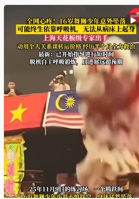 看到16岁舞狮少年在ICU跟着父亲学呼吸,突然发现了一个很大的问题,那就是,无论命运把人抛得多低,总有人愿意拼尽全力托住希望。 小翁坠桩后两次开颅才保住命,当地医院说可能终生靠呼吸机,家人快绝望时,上海“天花板”专家高亮接下挑战,协调空中转运降低费用,就为给这年轻生命多一点机会。转到上海医院时他完全依赖呼吸机,四肢没反应,但专家说他眼睛会动、意识还在,于是24小时守着调整治疗,半个月后能自主呼吸30分钟,左下肢也有了力气,这哪是治病,分明是在和死神抢人。 你说这世界是不是总藏着温暖?一边是少年努力学呼吸的笨拙模样,一边是专家和网友不放弃的劲头,哪有什么绝境,不过是有人在背后拼命托举罢了?
