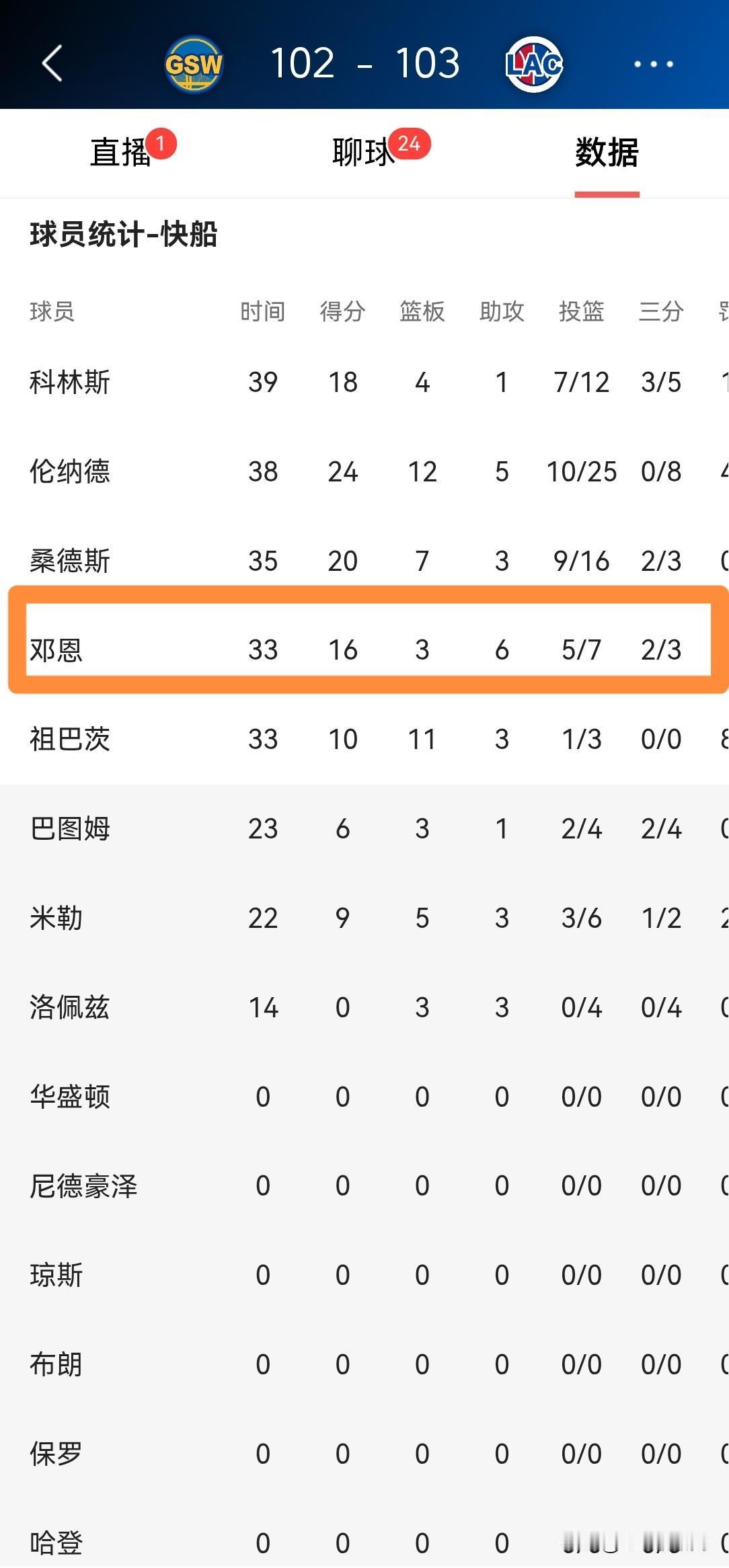 我必须要怒赞快船大将邓恩!在今天快船主场以103:102险胜勇士的比赛中,邓恩在攻防两端都打出了非常出色的表现,尤其是在关键的第四节比赛中,邓恩独得9分,成为了球队获胜的大功臣。 全场比赛下来,邓恩首发出战33分钟,投篮7中5,其中三分球3中2、罚球4中4得到16分3篮板6助攻1抢断。