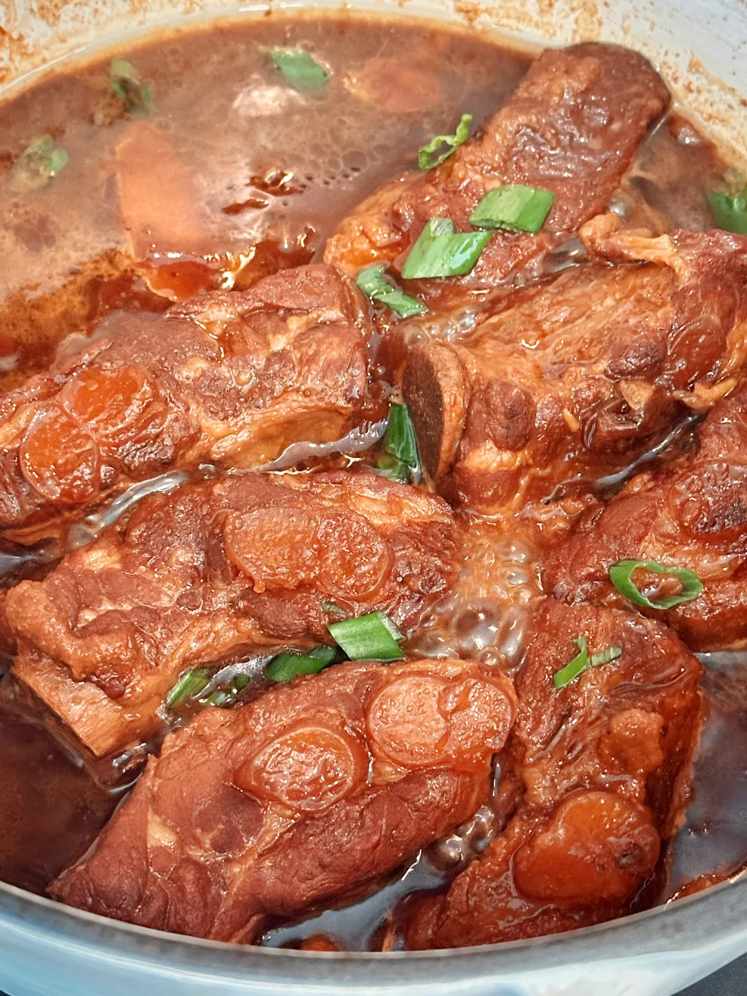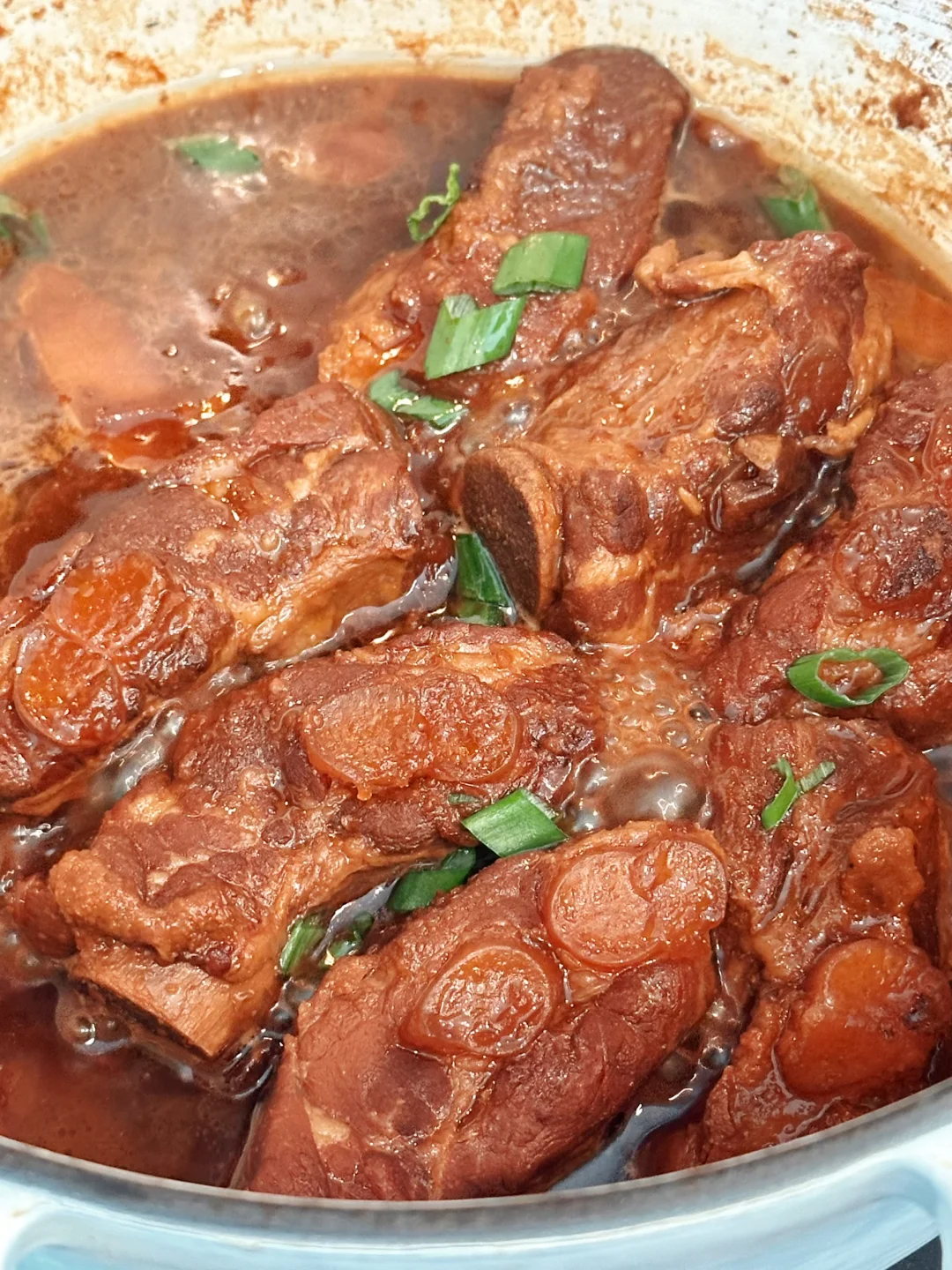 煮沸后转小火慢炖,煮2小时就是平时吃的好吃排骨的口感,煮4小时就开始变得透明软糯,再继续煮就是入口即化的果冻感。虽然需要很多时间,但真正投入做菜的时间很少,只需要是不是看看锅子,稍微加点水就好!