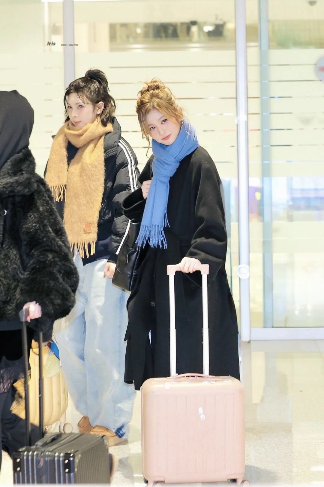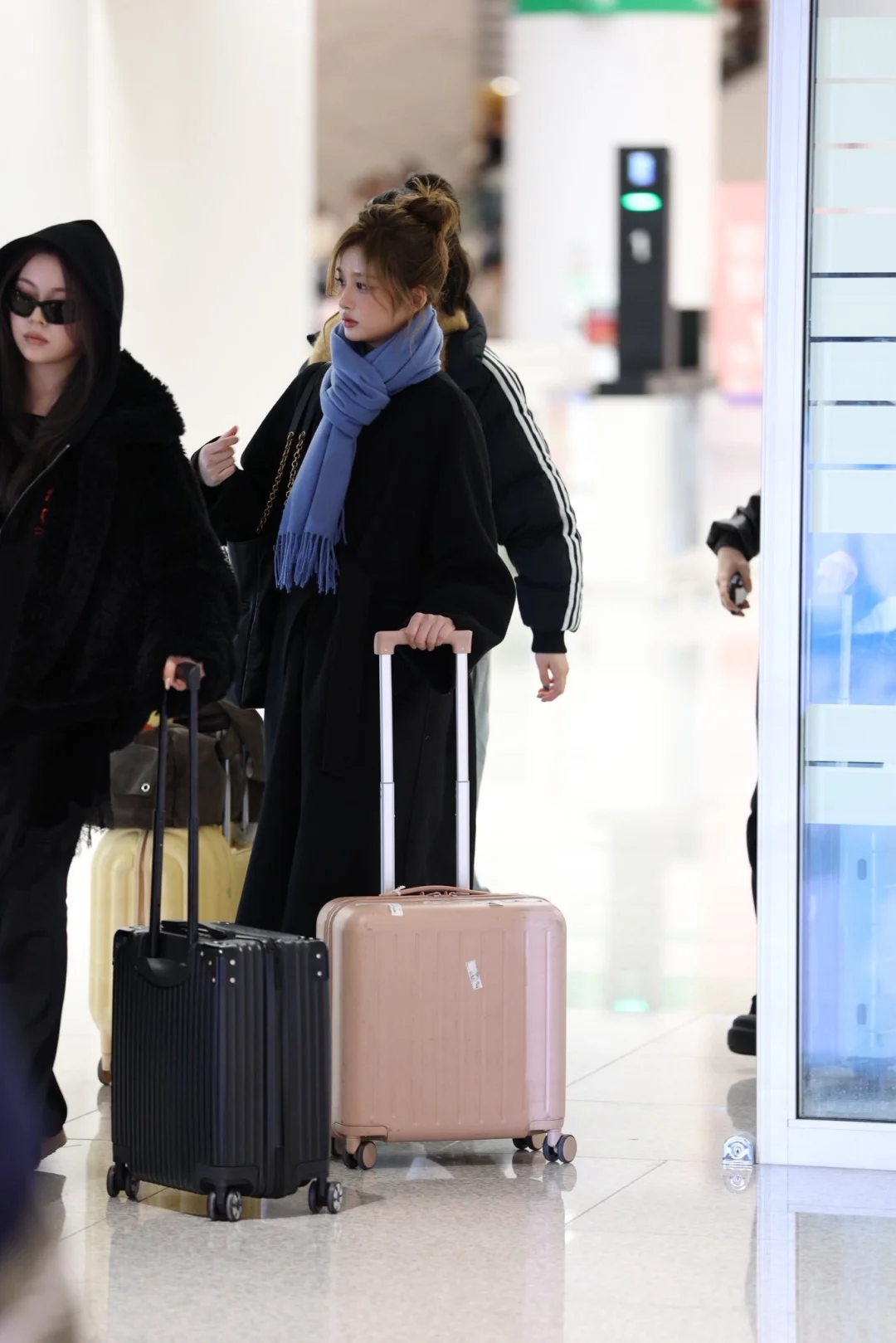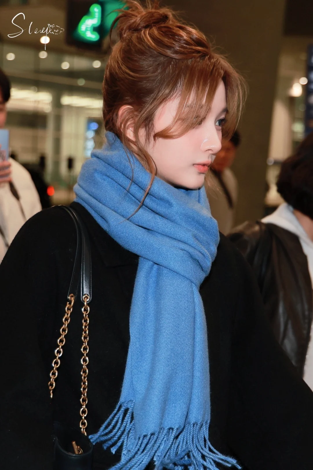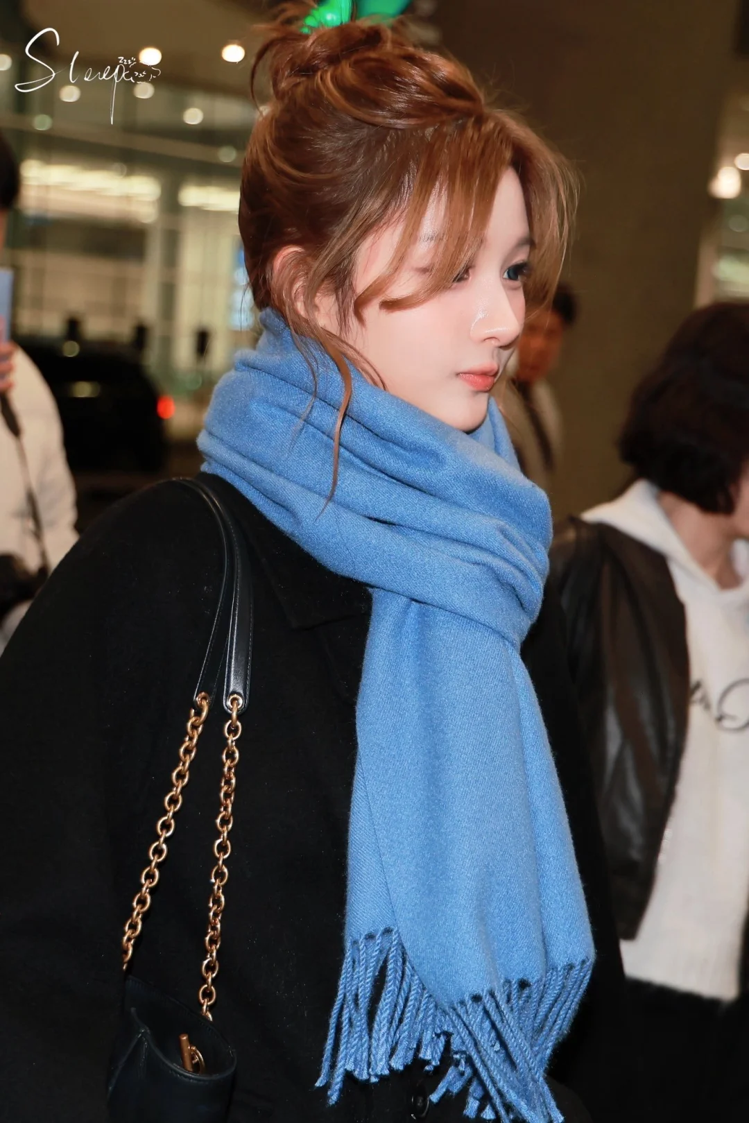 雪允这套机场私服真美啊,黑色大衣搭配蓝色围巾和丸子头,可可爱爱的也保暖! 机场穿搭 爱豆同款 女明星私服 女明星穿搭 雪允 图片来源于kun_kun0520 smts708