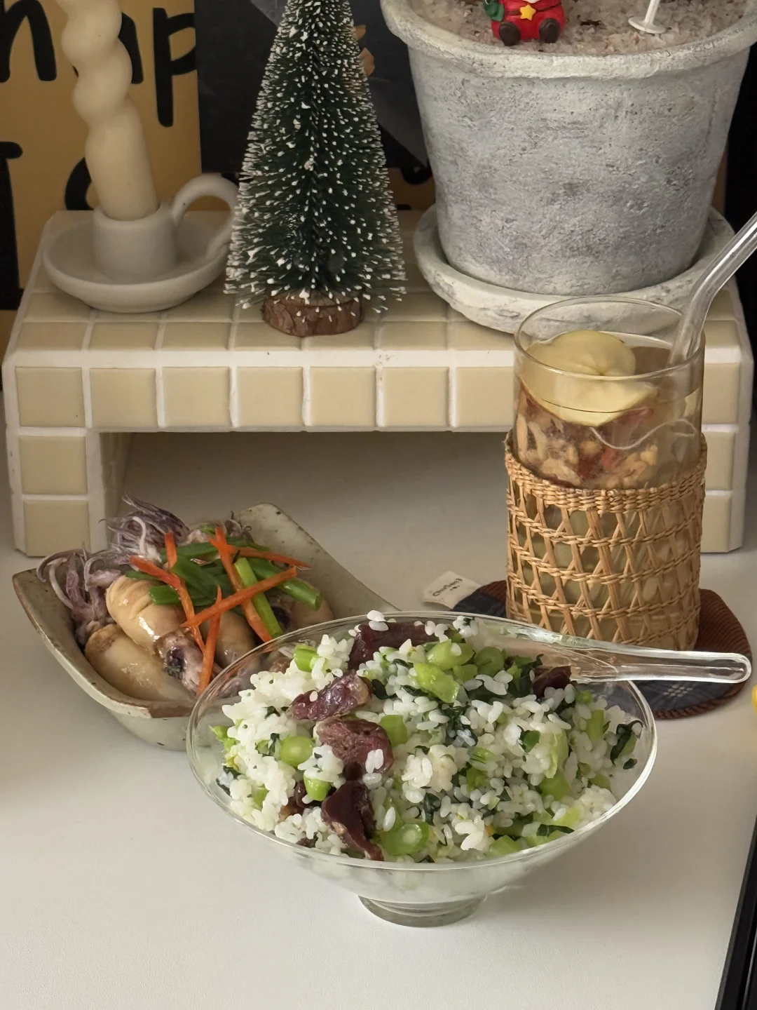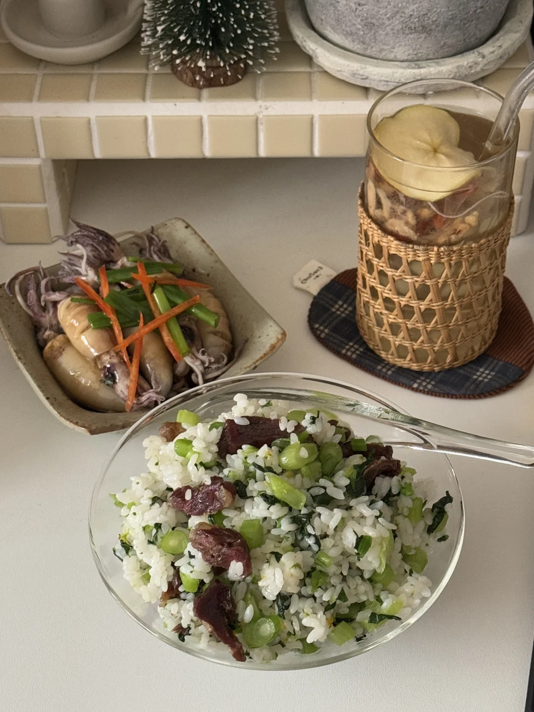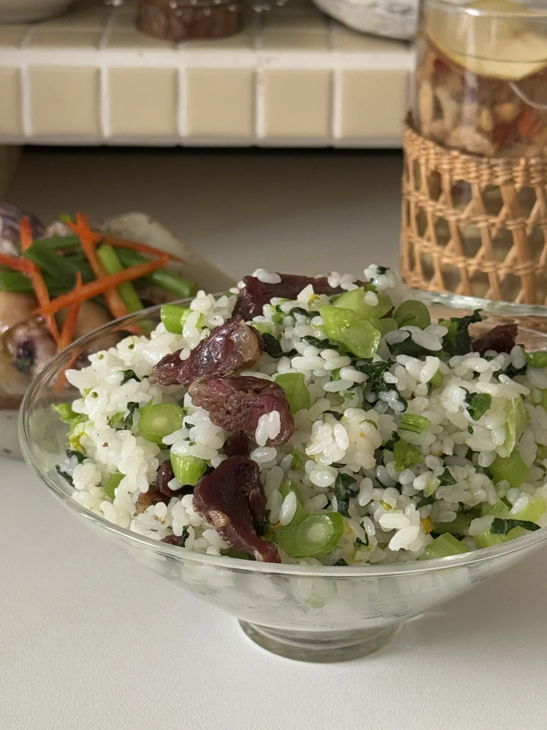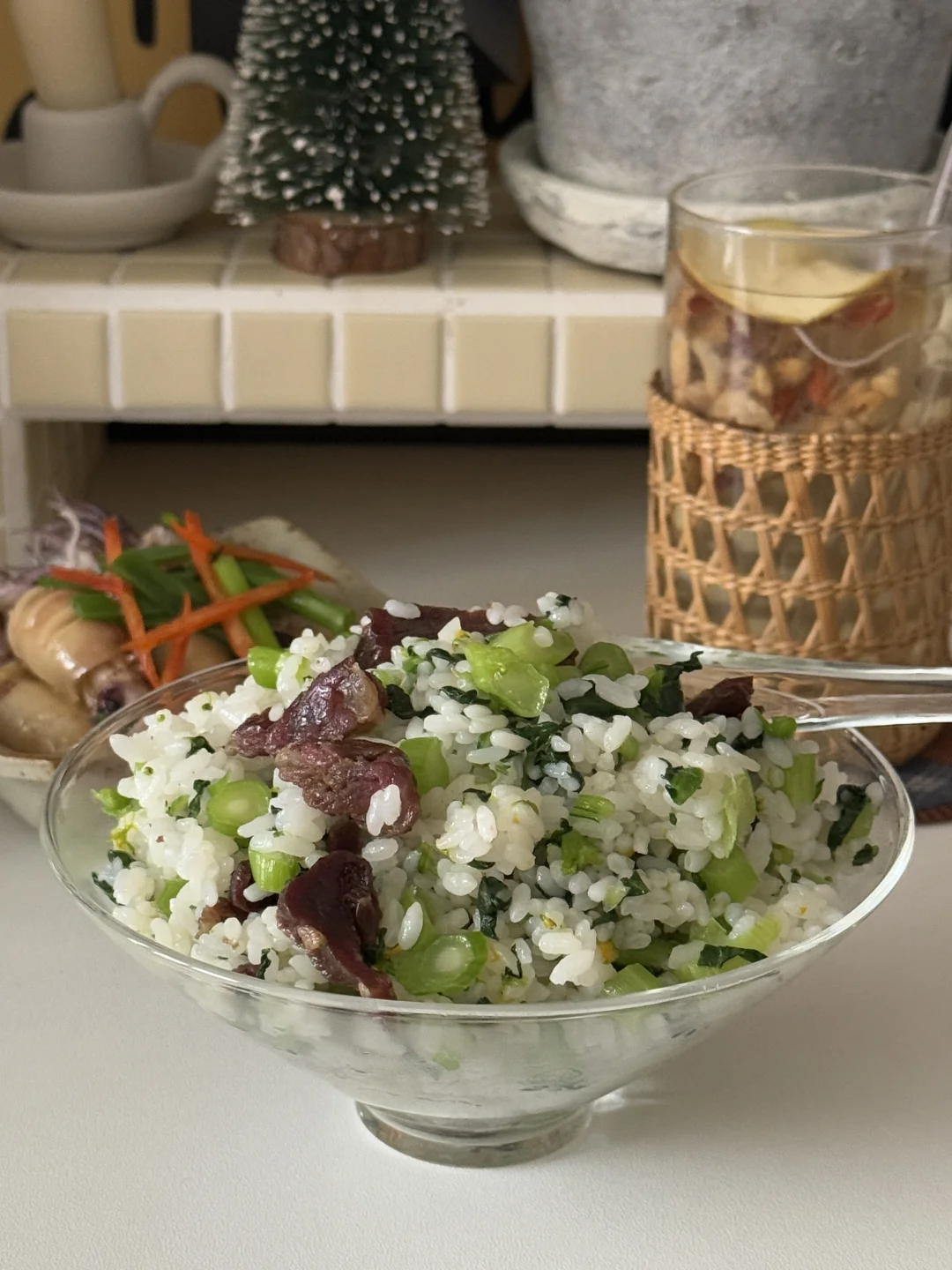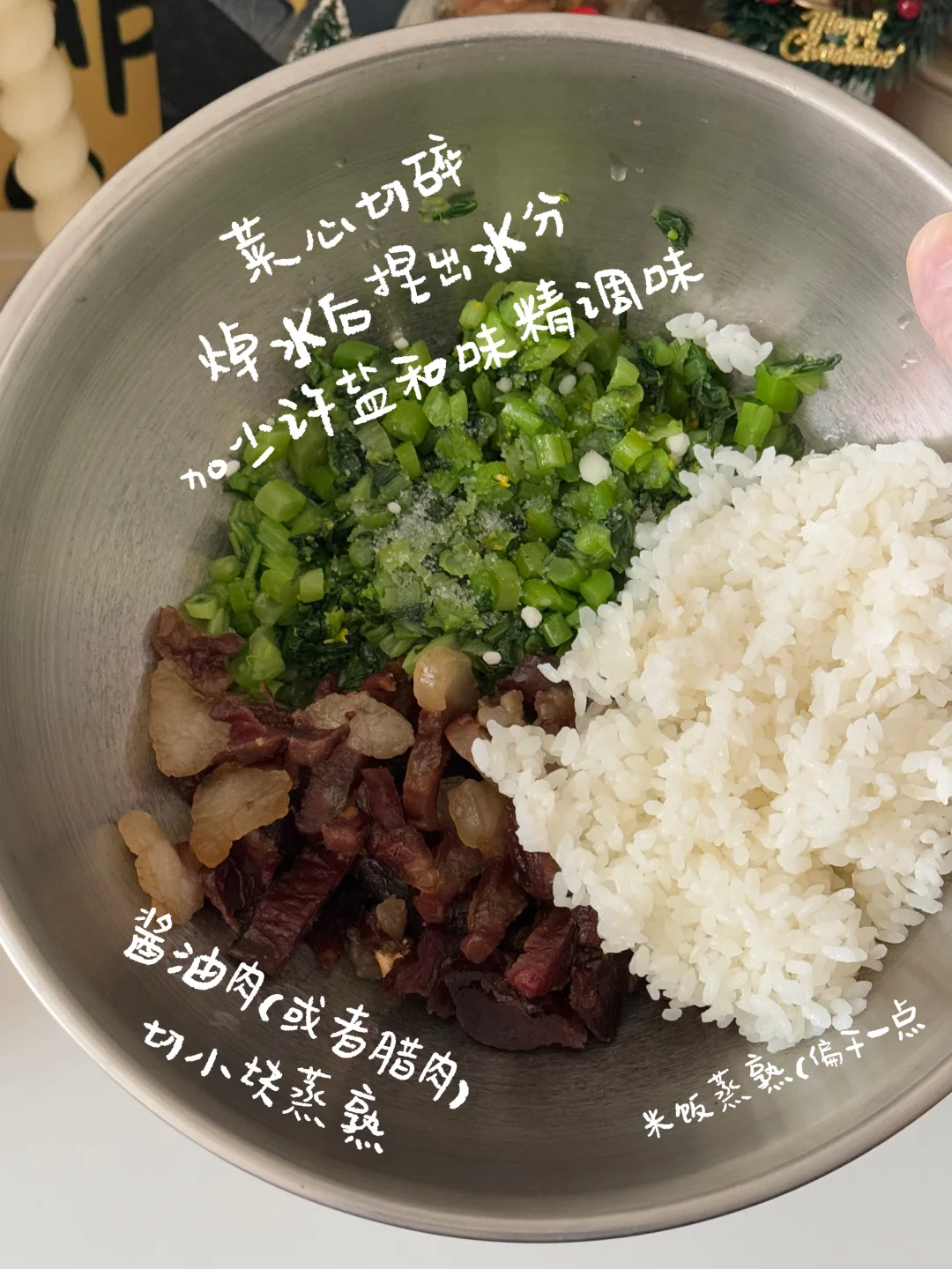 吃完这个没有人会再对菜饭说🙅♂️ 真的是属于吃完就爱上的那种[色色R] - 把自己喜欢的蔬菜焯水挤干水分💦 蔬菜里加了点盐和味精调味🧂 把酱油肉蒸熟(用腊肉腊肠什么都行 想油润一点就把肉蒸出来的油加到饭里🥣 或者加一小勺猪油(不加也好吃😋 - 感觉要比炒菜饭吃着更清爽[赞R] (酱油肉真的太太太好吃了[哭惹R])