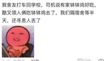 我舍友打车回学校,司机说有家钵钵鸡好吃,酷叉领人俩吃钵钵鸡去了,我们隔宿舍等半天,还寻思人丢了
