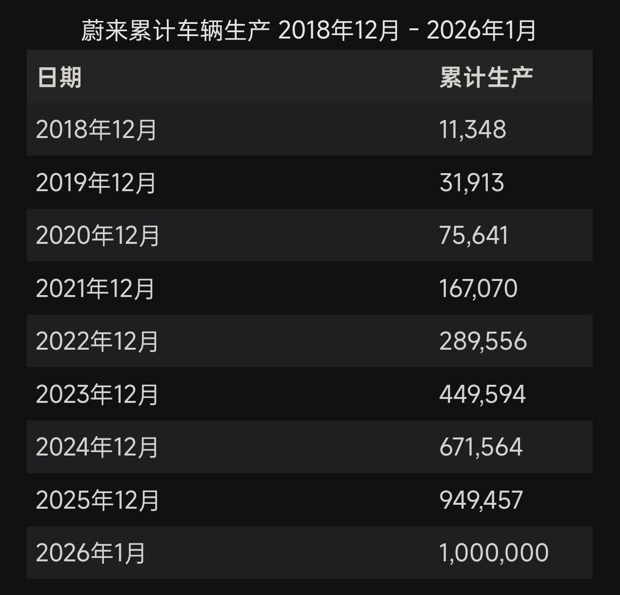 🎉祝贺蔚来 第100万台量产车下线。在安徽合肥的蔚来先进制造新桥F2工厂仪式现场,蔚来创始人、董事长、CEO李斌表示,未来将保持每年40%~50%的销量增长;同时,到2030年充换电站数量突破10000座。蔚来累计车辆生产 2018年12月 - 2026年1月6日 累计生产:2018年12月 11,3482019年12月 31,9132020年12月 75,6412021年12月 167,0702022年12月 289,5562023年12月 449,5942024年12月 671,5642025年12月 949,4572026年1月6日 1,000,000截至2025年12月底蔚来主品牌累计交付829,609台车乐道交付128,569台萤火虫交付39,414台大v聊车