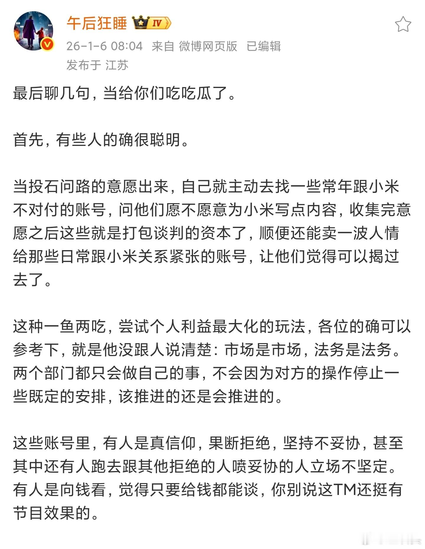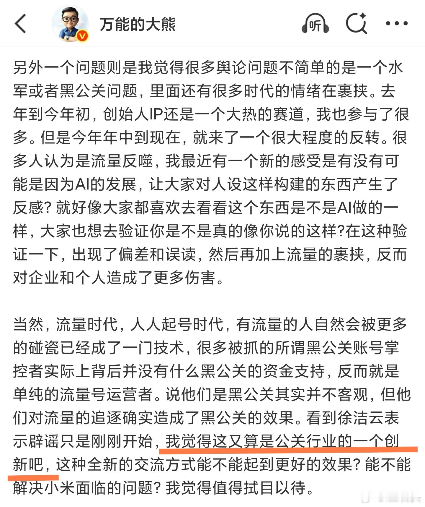 原来大熊打算创新一下公关行业,于是以供应商的身份打了进来投石问路,找了一群米黑头子打包谈判,所以这两天看到那么多吹的。结果此路不通,被米粉直接堵死了,一气之下米黑头子又把发过的贴删了,打算一条路走到天黑。不过我还是奉劝一下,别赔了买卖还得吃官司。