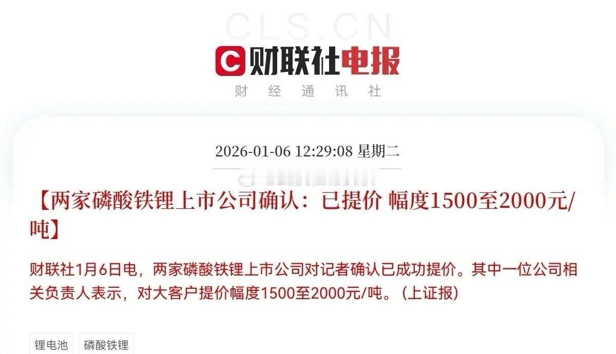 大利好!大利好!锂电池产业又迎来重大利好消息预计锂电池板块要起飞了,磷酸铁锂核心受益公司有望起飞…中午12点29分,财联社最新消息,两家磷酸铁锂上市公司对记者确认已经成功提价,其中一位公司相关负责人表示,对大客户提价幅度1500至2000元/吨,消息一出,股民们中饭都吃的特别香,一致认为这个提价对于锂电池上游产业是重大利好,此次磷酸铁锂成功提价,核心受益方主要集中在上游材料及资源环节,这将直接改善相关企业的盈利能力,产品直接涨价,且涨幅1500-2000元/吨,大概率能覆盖原材料如碳酸锂、磷酸铁的成本上涨,从而使单吨利润空间扩大,毛利率和净利率有望得到显著修复或提升,这也印证了磷酸铁锂核心公司的议价能力和行业供需格局的改善,提价对于头部磷酸铁锂公司来说是最大利好!股民们!坐稳扶好!受此利好消息刺激,预计锂电池板块要大爆发了,满仓这个方向的,估计又要吃大肉了磷酸铁锂提价受益公司有:湖南裕能、德方纳米、龙蟠科技、富临精工、云天化、兴发集团、川恒股份、龙佰集团、中核钛白、容百科技、华友钴业、比亚迪、当升科技、德方纳米等
