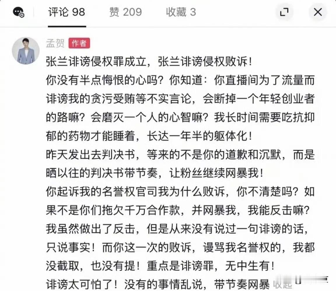 孟贺崩溃喊话张兰:我吃一年半抗抑郁药!胜诉了你还追着骂?孟贺又一次公开硬刚张兰,这次可不是简单拌嘴,简直是血泪控诉! 他直接质问:张兰你知道诽谤能逼死人吗?我的精神已经被彻底摧毁了! 他自曝惨状:每天靠抗抑郁药才能勉强睡着,这种生不如死的躯体化状态,已经持续整整一年半!打赢官司本以为能翻身,结果呢? 等来的却是新一轮网暴和带节奏,这日子简直没完没了!