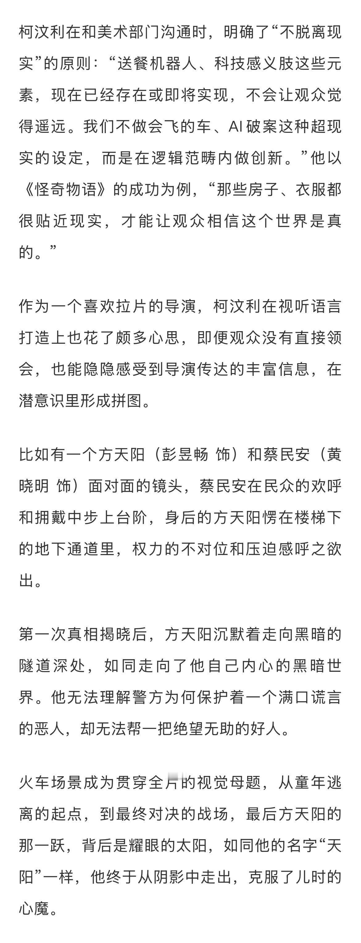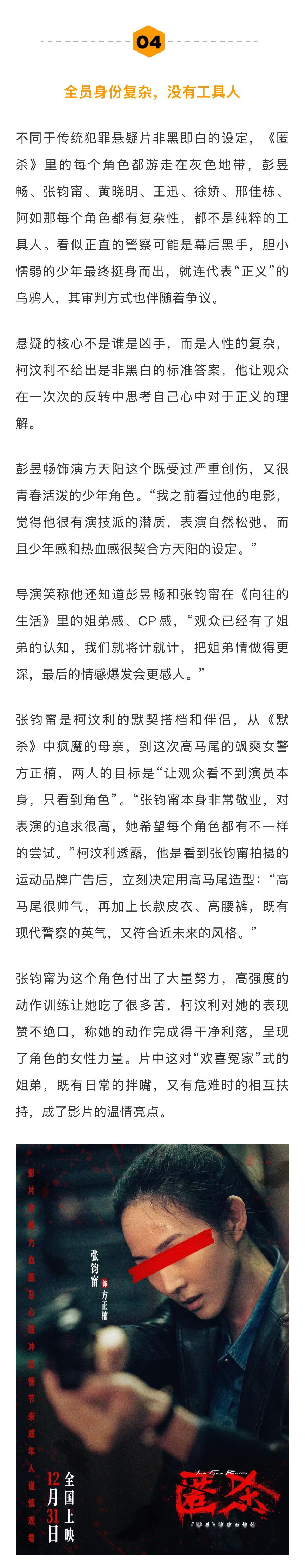 匿杀导演回应如何能让观众爽到柯汶利希望每次的杀法都有创造力 85年生的柯汶利是个“迷影型导演”,他从小就痴迷犯罪悬疑片,尤其喜欢希区柯克、大卫•芬奇、诺兰的电影,做过很多研究。他从不避讳自己作品的商业属性。曾有人提议他继续拍《默杀2》,但柯汶利没有急于延续IP,“我想看看观众对新故事的反馈,每个故事的创作都不容易,如果《匿杀》能被认可,我们再继续往下走。”《误杀》《默杀》《匿杀》三部作品顺着“被动-反抗-主动”的脉络生长,柯汶利表示,其实早期并没有刻意规划要做一个“杀”系列,它在一部一部的创作过程中自然形成的。清晰的类型标识能降低观众的认知成本,同样是以“杀”为核心的两字片名,观众可以直接获悉电影的类型和气质,带着明确的预期走进电影院。对市场沟通效率的重视,贯穿了他的创作始终。从《误杀》被动卷入杀人案的小人物,到《默杀》觉醒反抗的个体,再到《匿杀》中主动性更强的追凶者、惩恶者,柯汶利在保持核心“配方”的同时,也在升级着故事的复杂度与人物动机。此次的《匿杀》也没有延续华语犯罪悬疑片常见的东南亚背景,而是构建了一个地上城和地下城组成的二元世界。赛博朋克画风不仅为了视觉上更酷,也与叙事、人物塑造结合,比如彭昱畅饰演的角色方天阳的“假肢”,从童年阴影的痕迹,到最终见证他成为英雄的一瞬,这件重要道具承载了角色的弧光。此外还有张钧甯饰演的高马尾警官,和很久没有演过坏人的黄晓明,更多幕后故事,请看娱理独家↓