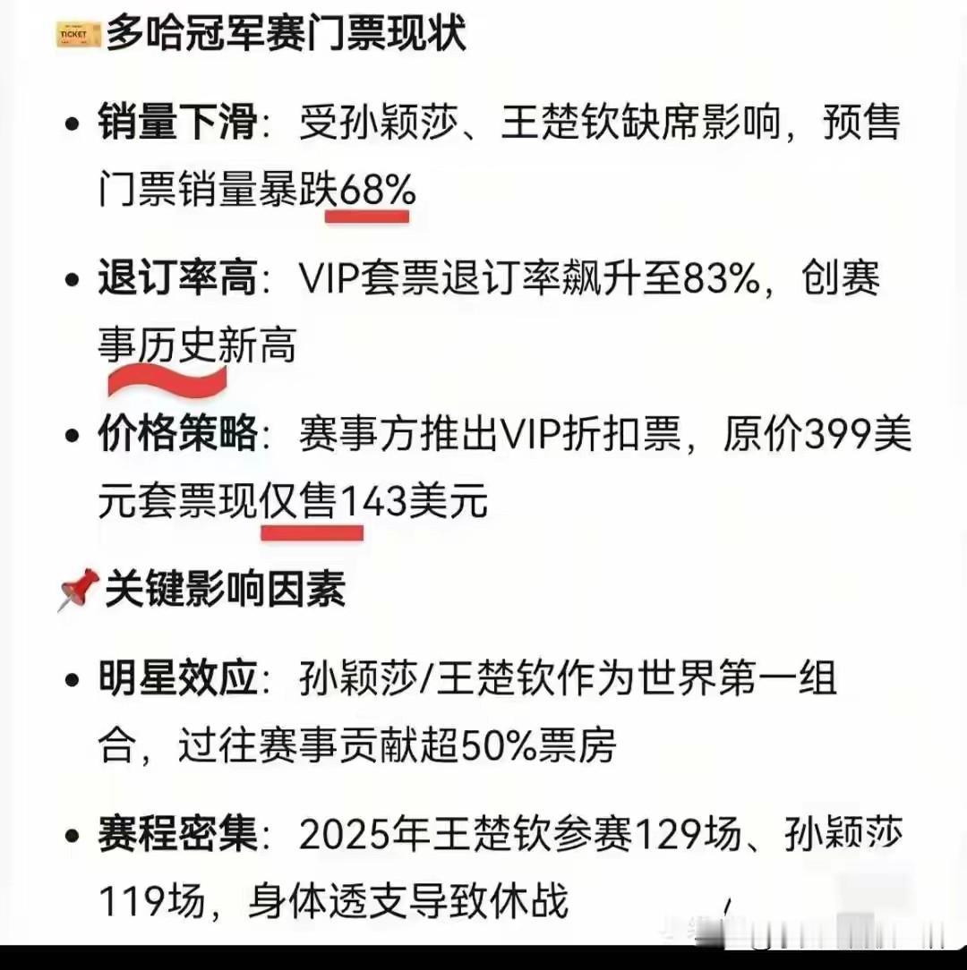 现在的乒乓球卖票 感觉特别像直播间卖货。 一个劲儿的拿着样衣吆喝, 一二三上链接搞预售。 冠军赛就像基础款只有单打。 大满贯就像拼接款, 混双,双打,外加单打。 三大赛就像高奢品牌定制, 美其名曰奥运会的资格赛。 亚洲杯就是基础款的尾单 比赛分组先循环再淘汰。 星球赛和常挑赛就像普通款 像直播间卖货就算了。 还不给观众买运费险。 就连七天无理由都没有。 主打一个一经售出不退不换!