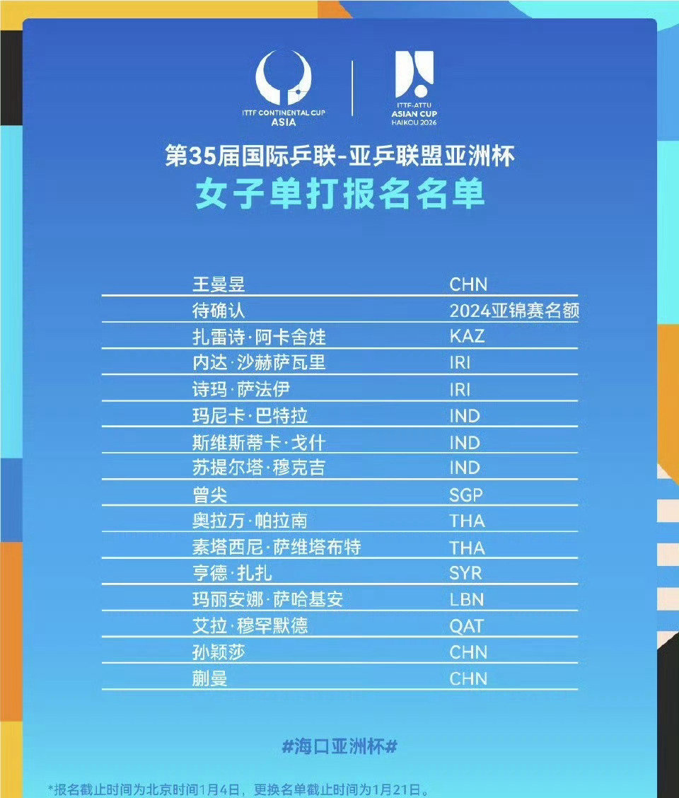 孙颖莎确认参加2026年亚洲杯官宣!世界第一孙颖莎锁定2026海口亚洲杯席位,2月4日-8日迎赛季首秀🔥 伤愈复出的她将从小组赛打起,向生涯首个亚洲杯女单冠军发起冲击,主场对决张本美和、伊藤美诚等强敌,央视全程直播,期待莎宝续写统治力!