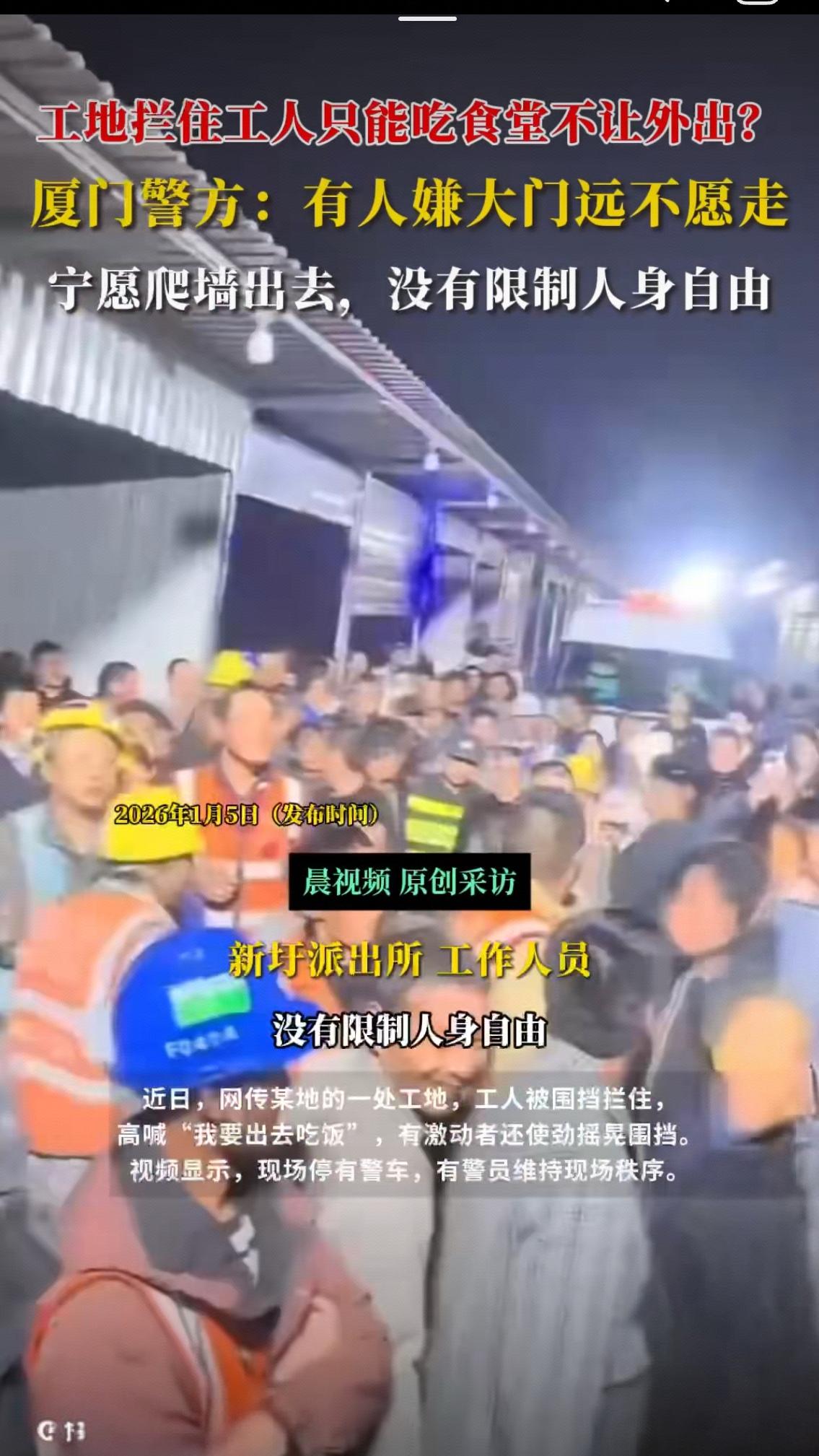 顺着工人嘶哑的呼喊声往下挖,你会发现这场“围栏风波”根本不是“嫌路远”那么简单——当一群人宁愿冒着危险爬墙,也不愿走进工地食堂,背后藏着的从来不是懒惰,而是被忽视的基本诉求与隐形的权益困境。 警方的通报看似厘清了“未限制人身自由”的事实,但“大门远”三个字却经不起细品。按照建筑施工规范,围挡设置本应兼顾安全与通行便利,可如果工人需要绕远路才能外出就餐,这本就是管理规划上的疏漏 。更值得深思的是,网友爆料的“食堂价高味差”才是矛盾的核心:不少工地食堂由项目方亲属或关联方承包,形成垄断式经营,饭菜质量堪忧却价格虚高,工人没有选择余地,只能被动接受。这哪里是“自愿就餐”,分明是用“管理规定”绑架了工人的吃饭选择权。 要知道,建筑工人干的是最耗体力的活,一顿热乎、实惠、合口味的饭菜,是他们恢复体力的基本需求。可现实中,他们建起了城市的高楼大厦,却连吃顿饭的尊严都要“翻墙争取”。有网友精准吐槽:“如果食堂真的好,谁愿意冒着坠伤风险爬墙?”这话戳中了本质——当管理方把“规范”当成利益输送的遮羞布,把工人的合理诉求当成“闹事”,所谓的“安全管理”就变了味。 更讽刺的是,相关部门早已明确要求工地保障食品安全与工人基本权益,厦门集美区住建部门也多次开展工地食品安全检查与文明施工整治 。可为何“食堂垄断”“权益漠视”的问题依然存在?这背后暴露的,是部分管理者“重利益轻民生”的扭曲心态——他们忘了,工人不是只会干活的工具,而是有血有肉、有基本需求的人。真正的工地管理,不该是围堵与限制,而应是尊重与保障:要么把食堂办好,让工人心甘情愿留下来吃;要么优化通行设计,让工人能方便地外出选择,这才是“安全第一”与“人性化管理”的真正结合。 这场风波之所以引发全网共鸣,是因为它戳中了无数劳动者的痛点:我们不怕吃苦受累,怕的是付出不被看见,权益不被尊重。希望所有工地都能引以为戒,别再用“大门远”“为你好”敷衍了事。工人的饭碗里,装着的不只是饭菜,更是尊严与公平。当每一位建设者都能吃得安心、活得体面,这座城市的发展才更有温度。你身边有没有遇到过类似的“奇葩管理”?欢迎在评论区聊聊你的看法!