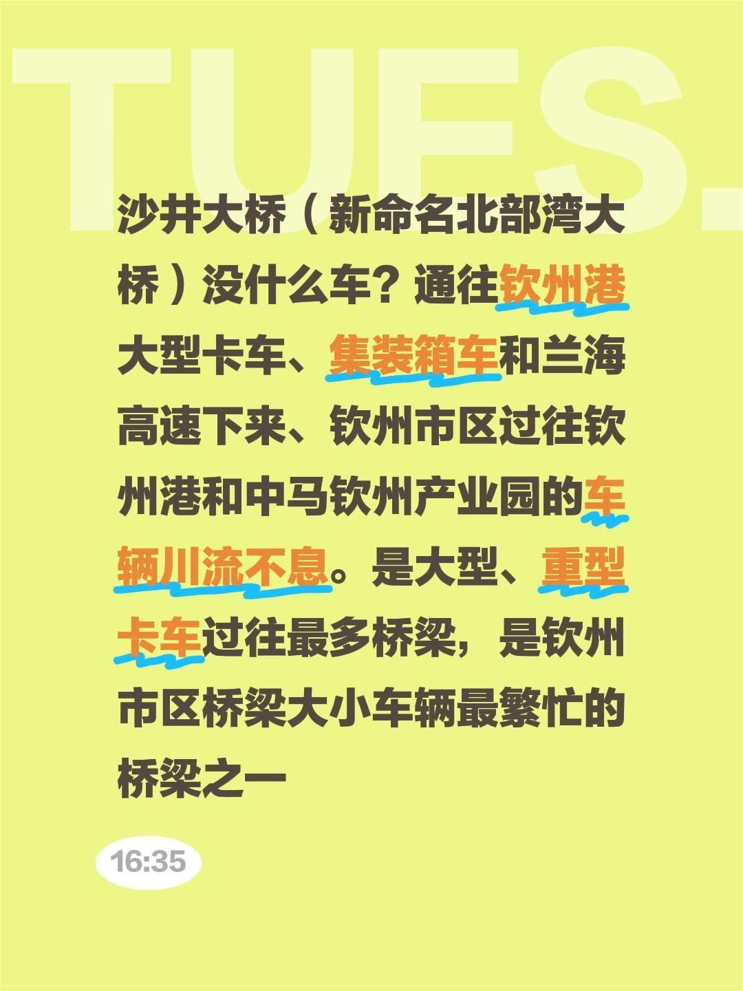 我评论了@明月清风 的作品: 沙井大桥(新命名北部湾大桥)没什么车?通往钦州港大型卡车、集装箱车和兰海高速下来、钦州市区过往钦州港和中马钦州产业园的车辆川流不息。是大型、重型卡车过往最多桥梁,是钦州市区桥梁大小车辆最繁忙的桥梁之一