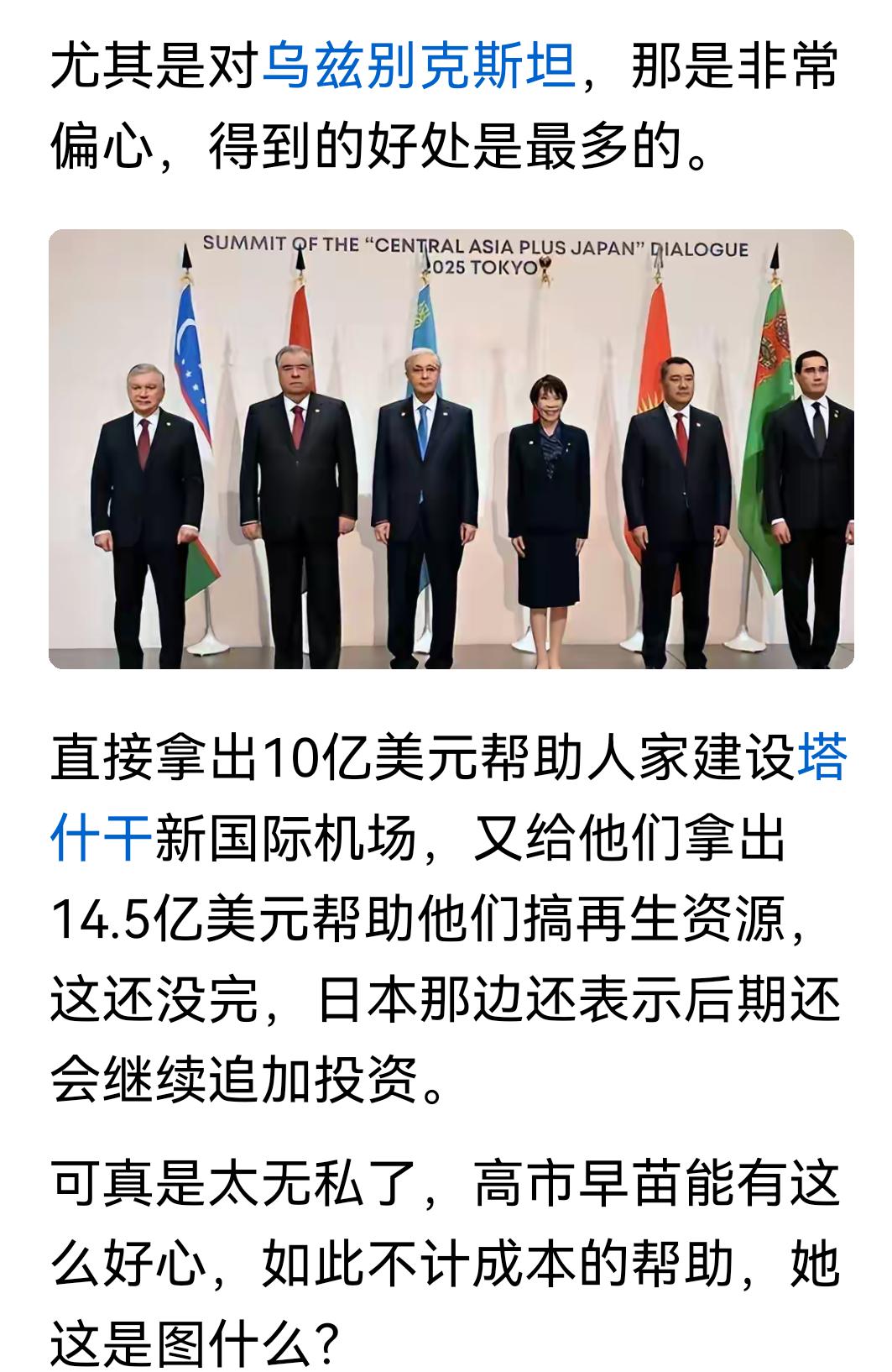 乌兹别克斯坦支持日本入常,没有必要过度解读! 高市早苗上任伊始就把外交搞得一团糟,受到国内国外铺天盖地的谴责。这次,高市早苗不惜重金在中亚大搞金钱外交,不过就是想拿钱买几句好话罢了,好让自己首相当得体面点。 乌兹别克斯坦当然知道自己的支持并不能让日本入常,也就是送个顺水人情罢了。 乌兹别克斯坦曾经是苏联的一部分,也是二战抗击日寇的重要成员,绝对不会背叛自己的历史真心支持日本入常。
