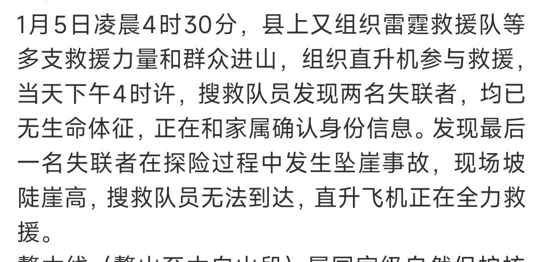 鳌太线失联4人1人获救2死1坠崖直升机全力搜救鳌太线坠崖失联人员我这人素质差,难听的话我来说:我认为当地应该找这几个人追讨救援费用,不仅要追讨,还要罚款,狠狠罚款,人死了也要从遗产里扣,没有豁免一说。官方层面早就发文全面禁止穿越鳌太线,这几个人还专门避开了管护站,属于明知故犯。现在因为他们的违规穿越,导致当地出动了大批救援队伍和救援直升机,还动员了群众上山救援,这肯定是一笔非常大的开支,如果不是这几个人违规穿越,这些开支原本没必要。如果违规穿越鳌太线没有任何成本,出了问题还有人可以兜底可以无偿呼叫救援,那实际上就是在助长这种风气。只有让违规的人付出代价,让他们知道违规有后果,而且很严重,才能避免更多人效仿。这不是冷血,这是为了救更多人。 (注:评论区有人说救援不是免费,这非常高,我举双手双脚赞成,美中不足的是费用还是太低)