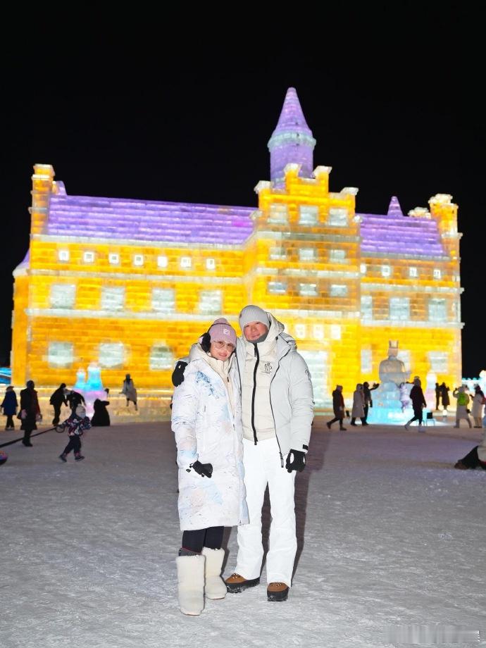 胡杏儿一家哈尔滨旅游 胡杏儿一家五口在哈尔滨旅游,三个小朋友穿着同款红色长羽绒服,萌奥!