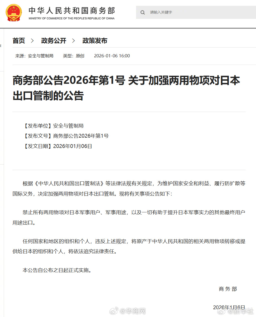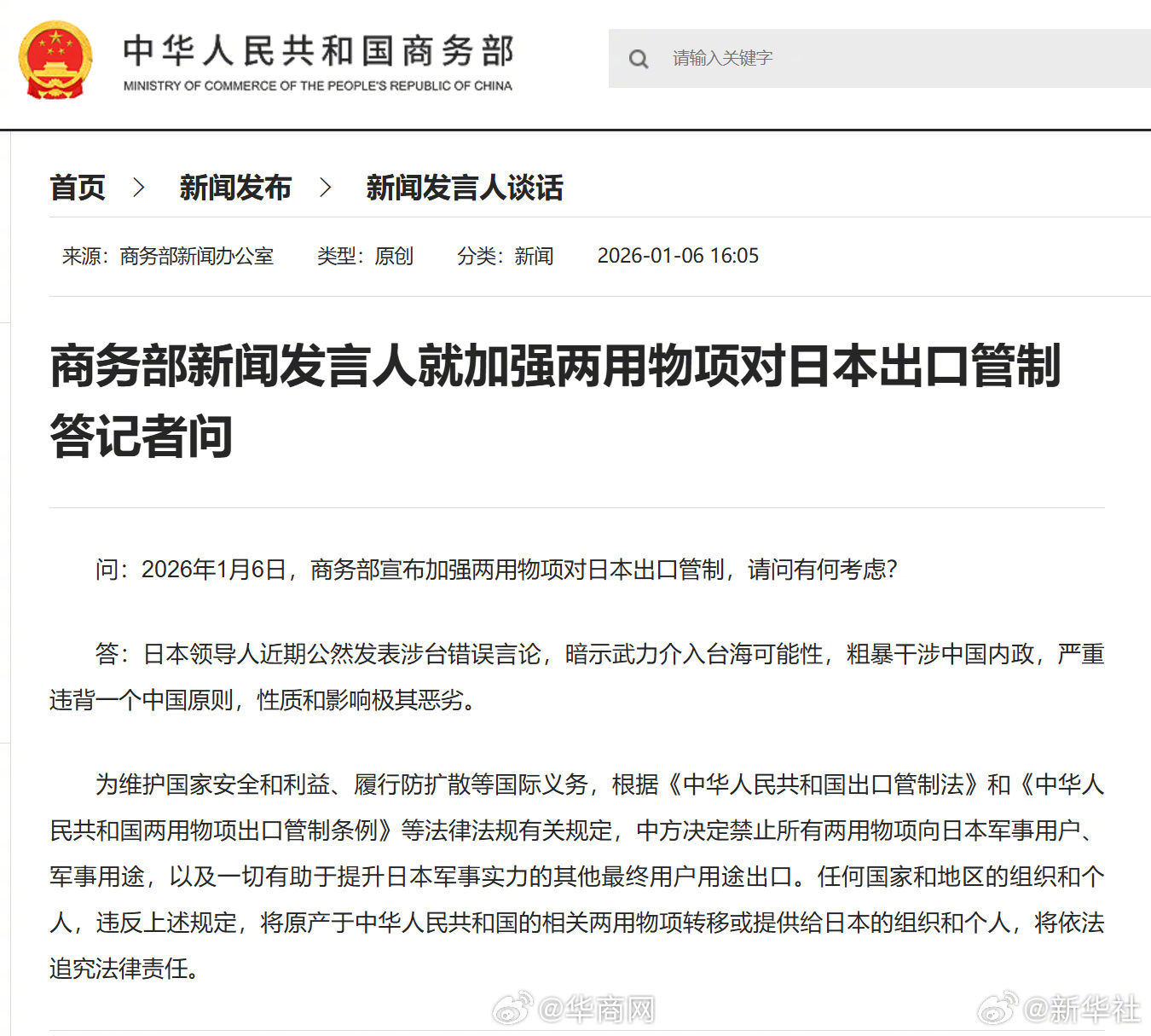 #商务部就加强两用物项对日出口管制答问#【商务部新闻发言人就加强两用物项对日本出口管制答记者问】问:2026年1月6日,商务部宣布加强两用物项对日本出口管制,请问有何考虑?答:日本领导人近期公然发表涉台错误言论,暗示武力介入台海可能性,粗暴干涉中国内政,严重违背一个中国原则,性质和影响极其恶劣。为维护国家安全和利益、履行防扩散等国际义务,根据《中华人民共和国出口管制法》和《中华人民共和国两用物项出口管制条例》等法律法规有关规定,中方决定禁止所有两用物项向日本军事用户、军事用途,以及一切有助于提升日本军事实力的其他最终用户用途出口。任何国家和地区的组织和个人,违反上述规定,将原产于中华人民共和国的相关两用物项转移或提供给日本的组织和个人,将依法追究法律责任。#禁止所有两用物项对日本军事用途出口#