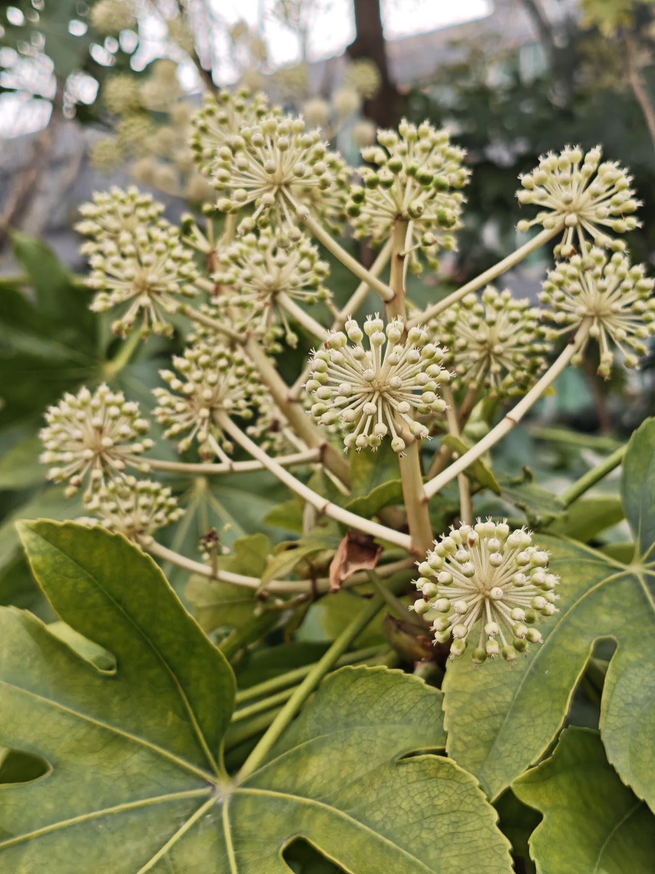 在公园闲逛时,无意间撞见了这丛八角金盘的花穗。细碎的花苞簇拥成伞状,嫩黄的枝桠从浓绿的叶片间探出来,在冬日的树影里悄悄舒展着生机。它不像玫瑰那般张扬,也没有梅香的清冽,就这么安静地开在角落,不刻意争艳,却把生命力藏进了每一粒小小的花苞里。这模样突然让我想起,生活里最动人的美好,往往不是轰轰烈烈的绽放,而是像它这样,在属于自己的一方天地里,不紧不慢地生长,悄无声息地盛开。