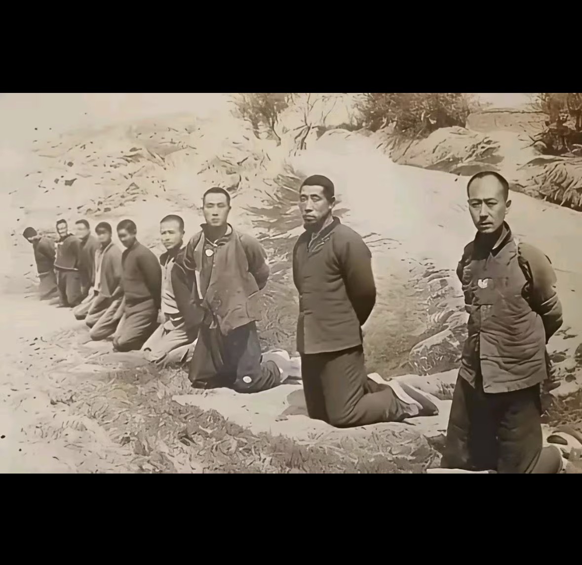 这张照片是九一八事变后,被日本侵略者俘获的九位东北抗日志士就义前的留影。这些志士是来自东北的普通群众(农民、教师、车夫等),他们因奋起反抗日寇侵略被捕,面对敌人的利诱与酷刑始终不屈。日寇本想拍摄“顺民”影像进行虚假宣传,却意外记录下他们大义凛然、视死如归的气节:镜头前的志士们双手被缚、跪地而立,眼神里没有丝毫畏惧,尽显中国人民反抗外来侵略的钢铁意志。