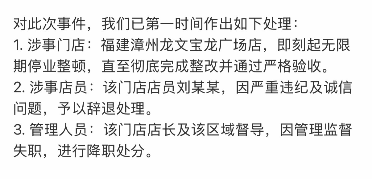 霸王茶姬手打事件官方通报来了,涉事门店停业整顿,涉事店员辞退处理,店长督导降职处分。视频中的奶茶被当场倒掉,并未对外出售,个人行为不必上升品牌,又可以美美的点一杯了霸王茶姬通报 霸王茶姬辞退涉事店员