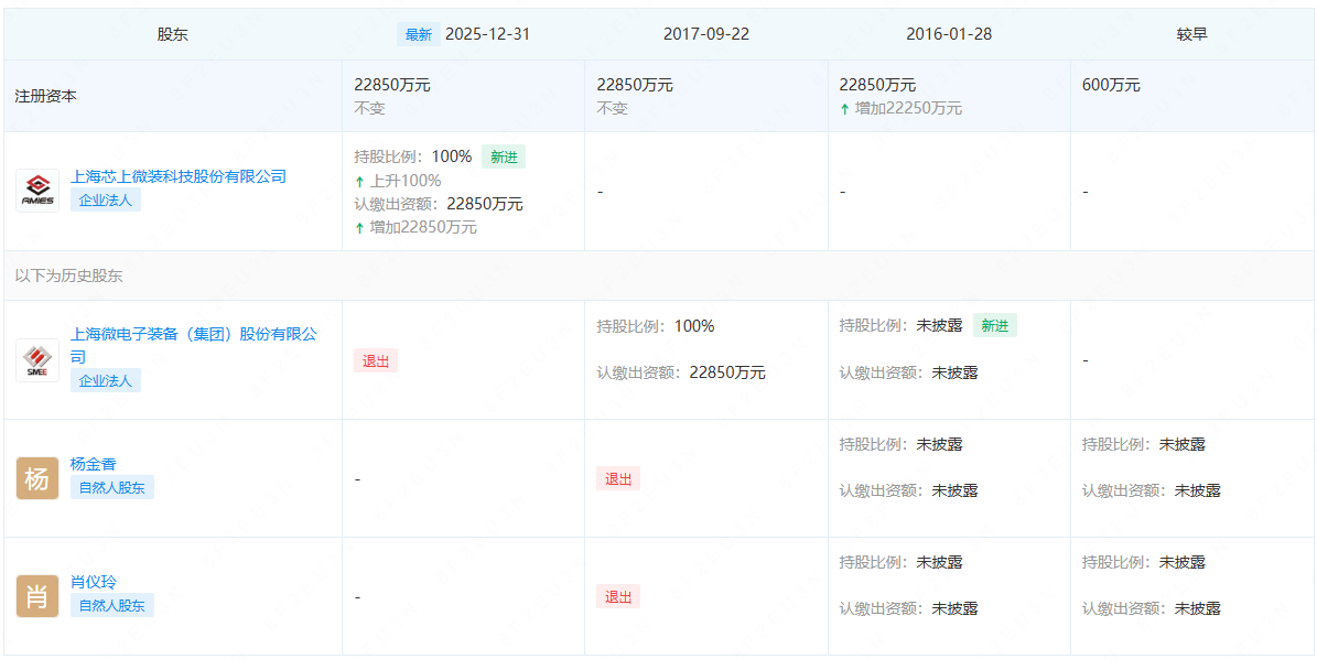 《科创板日报》1月6日讯(记者陈俊清)工商信息显示,近日,上海威耀实业有限公司(下称:“威耀实业”)发生工商变更,上海微电子装备(集团)股份有限公司(下称:“上海微电子”)退出股东,新增上海芯上微装科技股份有限公司(下称:“芯上微装”)为全资股东,认缴出资额2.285亿元。