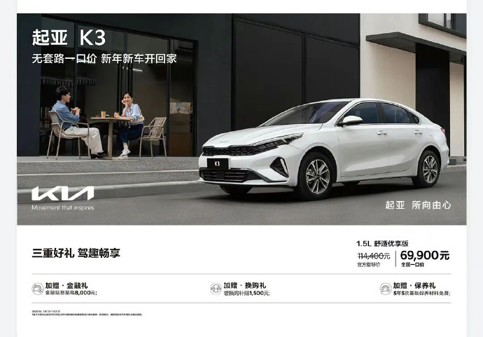 这算最便宜的合资自动挡新车了吧?起亚中国宣布:奕跑、K3车型实行全国一口价。其中,2026款起亚奕跑1.4L IVT趣享自动版,全国一口价5.59万元;起亚K3 1.5L舒适优享版,全国一口价6.99万元。挺合适的嘿!一口价起亚