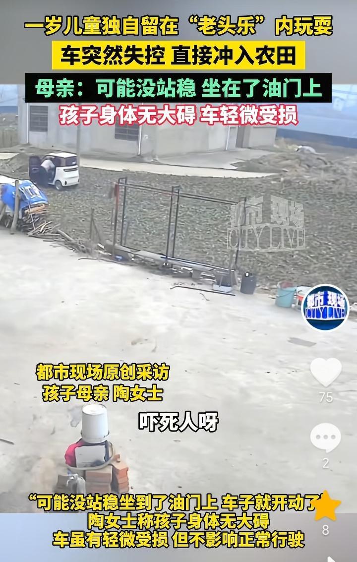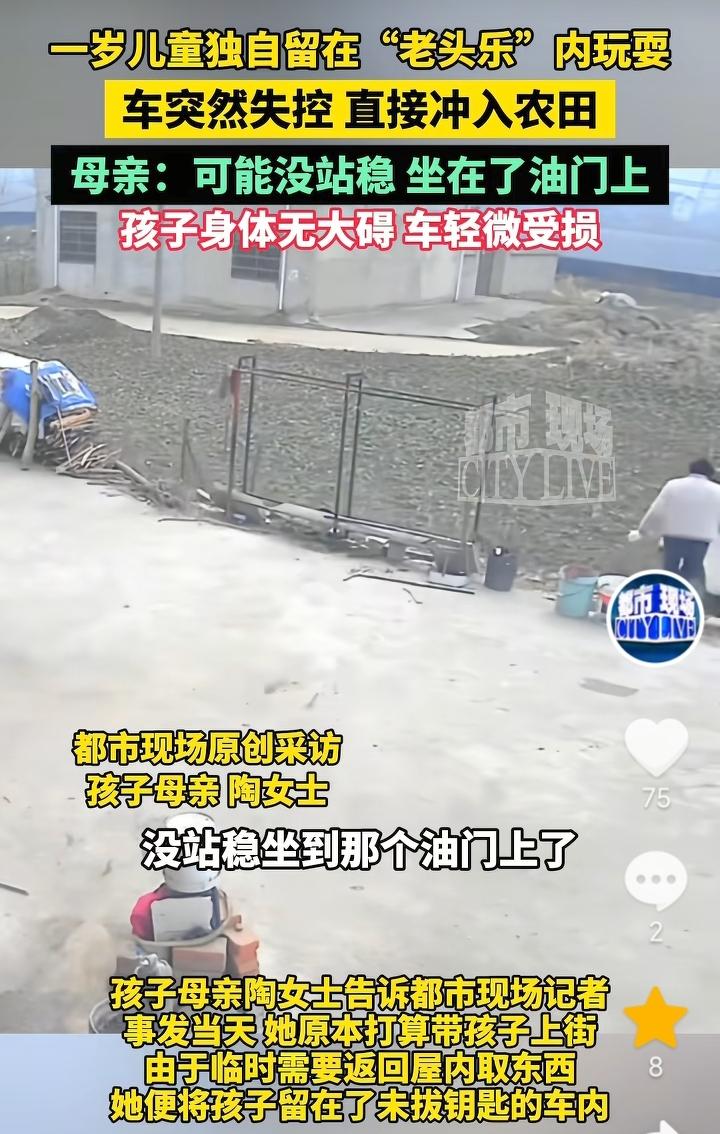 家长也是心大!安徽阜阳,家长回家拿东西没拔钥匙,独自把一名一岁多孩子留在“老头乐”内玩耍,结果车辆突然失控冲入农田,好在孩子无大碍,车辆也只是轻微受损,孩子家长表示,原本是想带孩子上街,由于临时需要返回屋里取东西,就把孩子留在了车上,可能是孩子没站稳,坐在了油门上。 这家长也是心大,下车不拔钥匙,还把那么小的孩子独自留在车上,多亏了是冲进农田孩子无大碍,要是下面是河或者是陡坡,那么后果就不堪设想。 开车就不能嫌麻烦,一切都要以安全为主,下车不管时间长短,拔钥匙拉手刹一定不能忘记,要养成习惯。